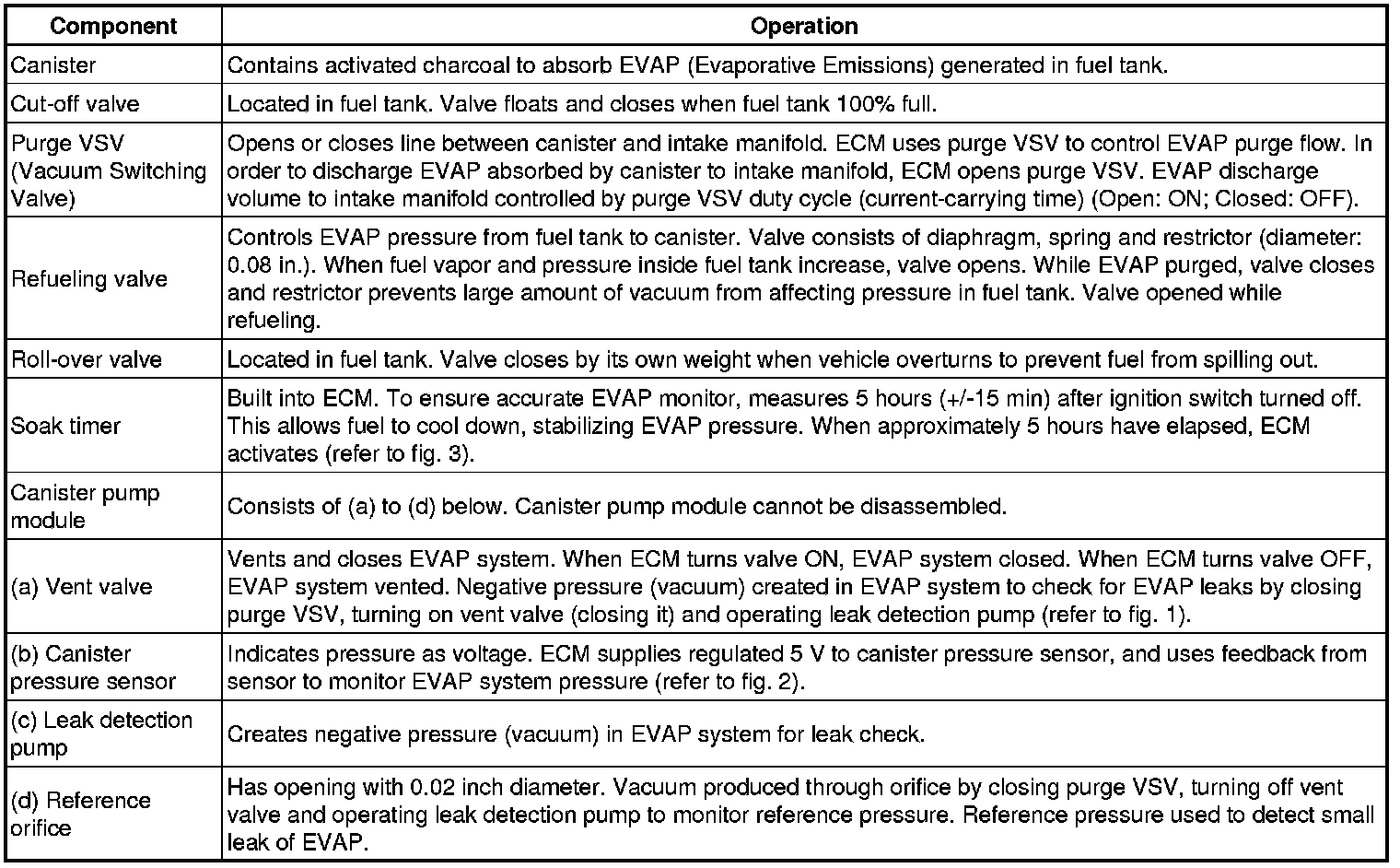 The leak detection pump creates negative pressure (vacuum) in the EVAP system and the pressure is measured. Finally, the ECM monitors for leaks from the EVAP system, and malfunctions in both the canister pump module and purge VSV based on the EVAP pressure.
