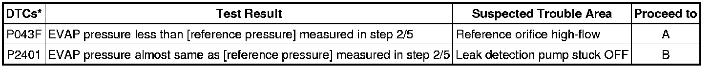 If the reference pressure difference between the first and second checks is greater than the specification, all the DTCs relating to the reference pressure (P043E, P043F, P2401, P2402 and P2419) are stored.