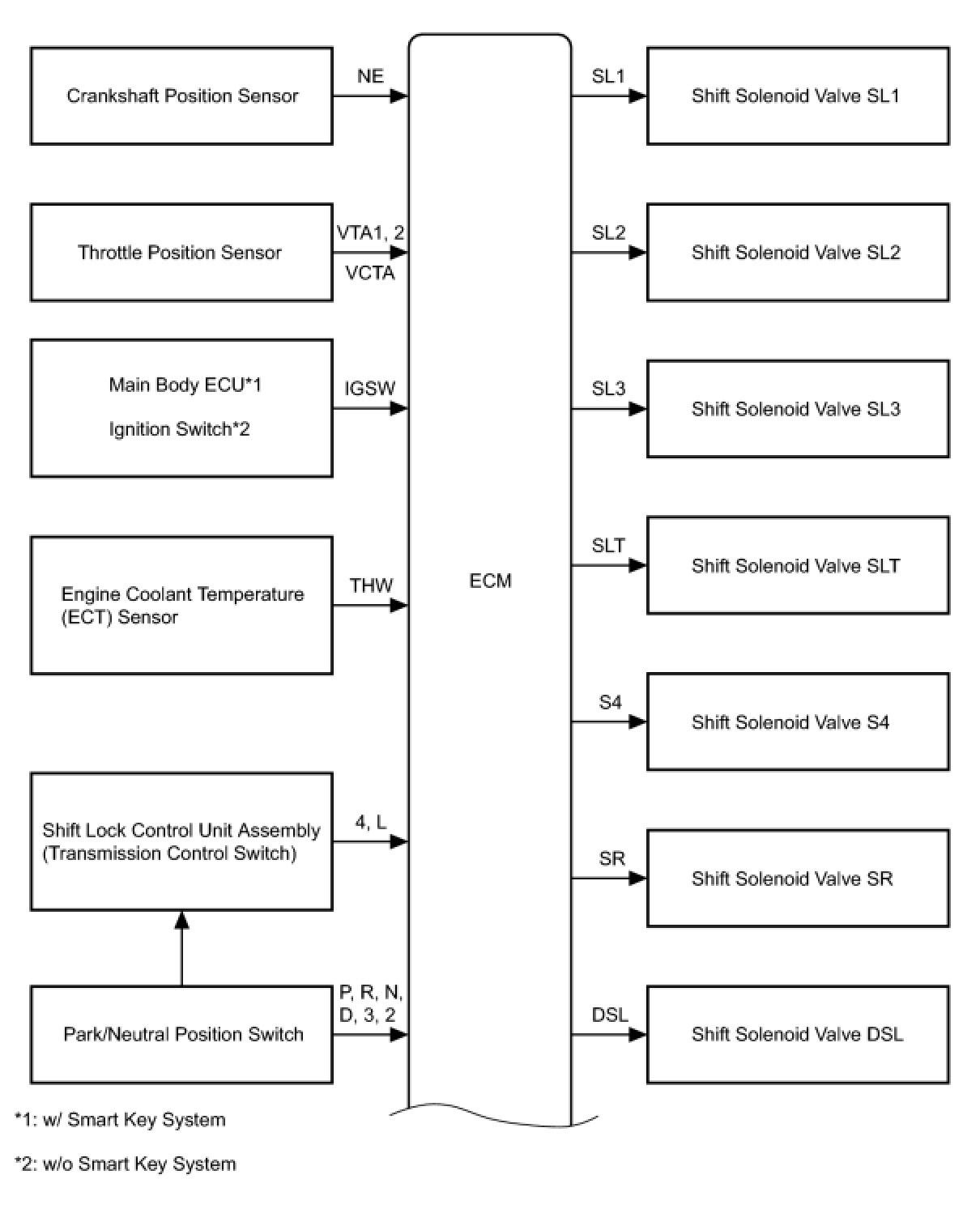 The configuration of the electronic control system in the U151E automatic transaxle is as shown in the following chart.