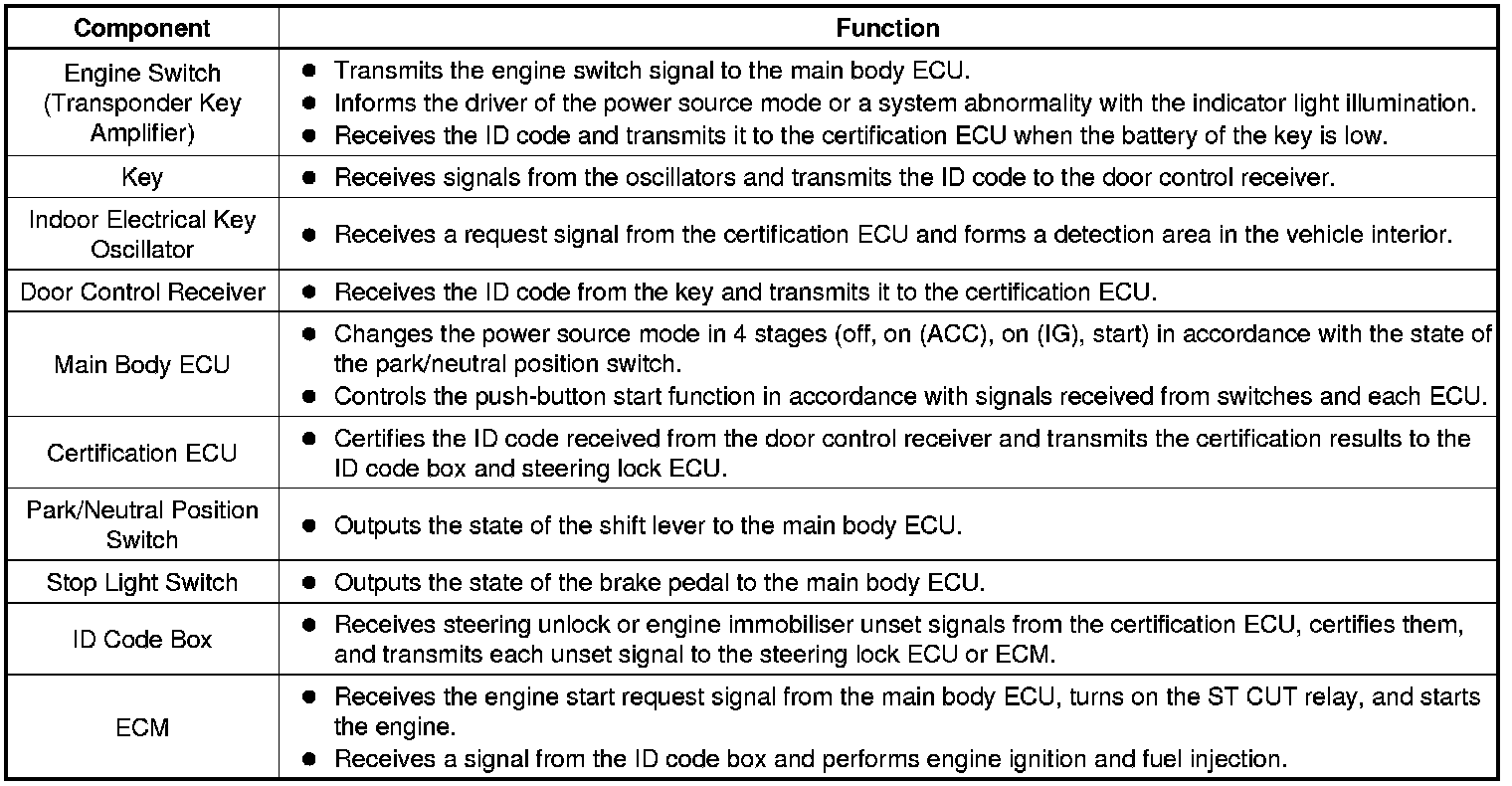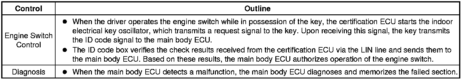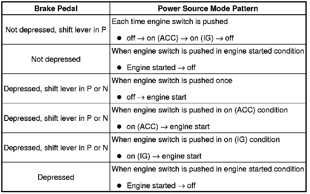 (a) The push-button start uses a push-type engine switch, which the driver can operate by merely carrying the key. This system consists primarily of the main body ECU, engine switch, ID code box, steering lock ECU, key, ACC relay, IG1 relay, IG2 relay and certification ECU. The main body ECU controls the system. This function operates in cooperation with the smart key system. The table below shows the transition of the engine switch state, which depends on whether the brake pedal is depressed or released.