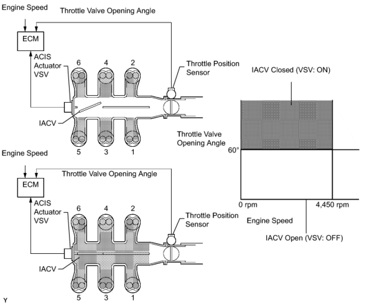 When the engine speed is between 0 and 4,450 rpm and the throttle valve opening angle is 60° or more, the ECM supplies current to the VSV (ON status) to close the IACV. Under other conditions, the VSV is usually OFF and the IACV is open.