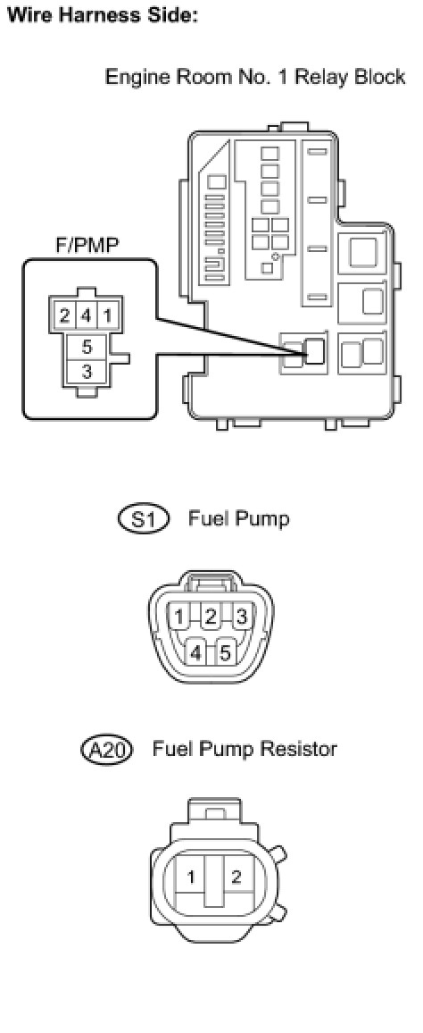The F/PMP relay switches the fuel pump speed according to the engine conditions. The fuel pump operates when the ECM receives the starter-operating signal (STA) and crankshaft-rotating signal (NE). The F/PMP relay is turned ON while the engine is idling or operating at low load. This causes current to flow through the fuel pump resistor to the fuel pump. The fuel pump then operates at low speed. The F/PMP relay is turned OFF while the engine is cranking or operating at high load. The fuel pump then operates at normal speed.