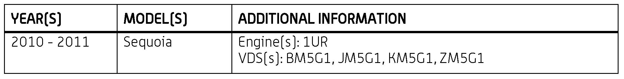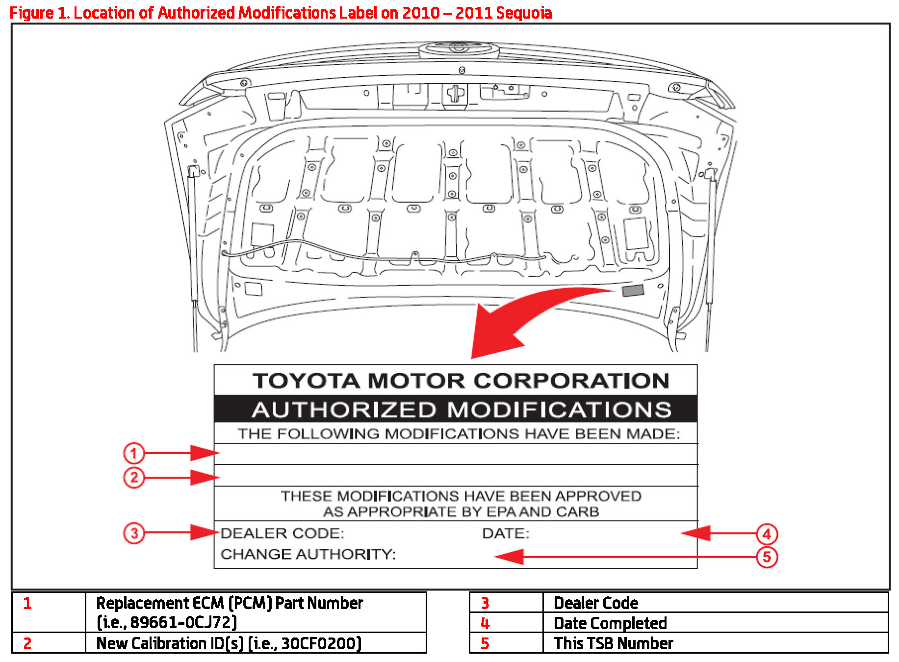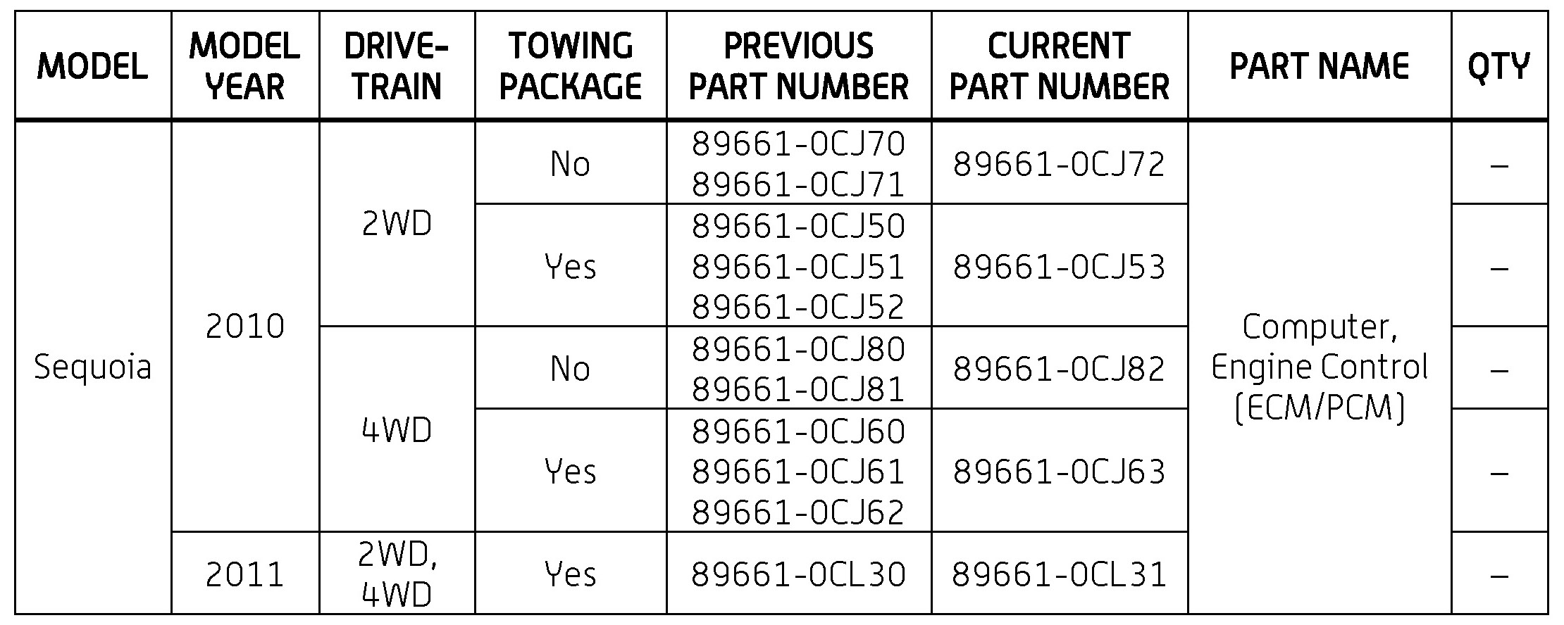 Some 2010 - 2011 model year Sequoia vehicles with the 1UR-FE (4.6 L) engine may exhibit non-linear acceleration from a stop under certain conditions of low engine rpm with high engine load. The Engine Control Module/ECM (SAE term: Powertrain Control Module/PCM) logic has been revised to address this condition. Use the following repair procedure to recalibrate the ECM (PCM).