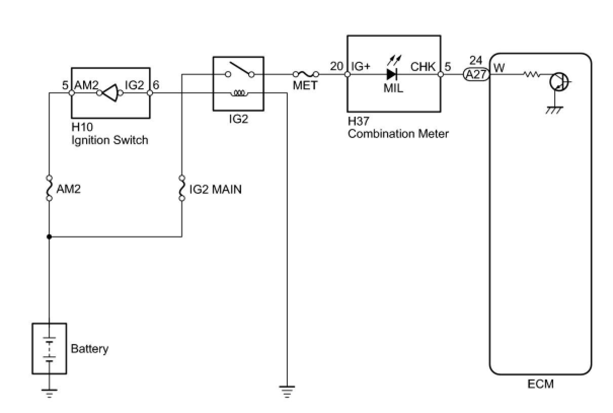 The MIL (Malfunction Indicator Lamp) is used to indicate vehicle malfunction detections by the ECM. When the ignition switch is turned to ON, power is supplied to the MIL circuit, and the ECM provides the circuit ground which illuminates the MIL.