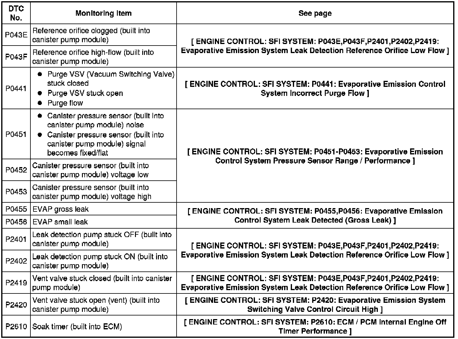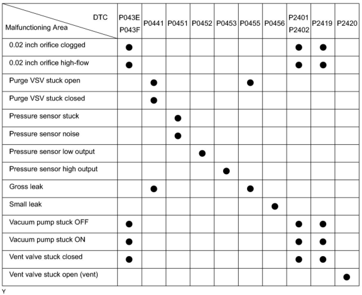 If any EVAP system DTCs are stored, the malfunctioning area can be determined using the table below.