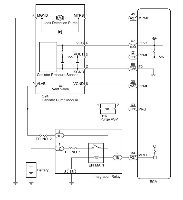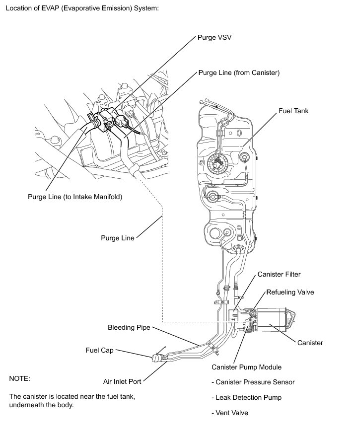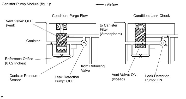 The leak detection pump creates negative pressure (vacuum) in the EVAP system and the pressure is measured. Finally, the ECM monitors for leaks from the EVAP system, and malfunctions in both the canister pump module and purge VSV based on the EVAP pressure.