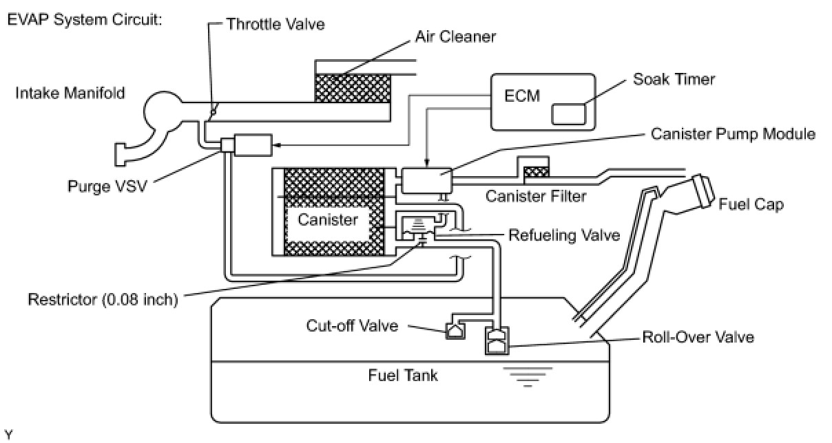 While the engine is running, if a predetermined condition (closed-loop, etc.) is met, the purge VSV is opened by the ECM and stored fuel vapors in the canister are purged into the intake manifold. The ECM changes the duty cycle ratio of the purge VSV to control purge flow volume.
