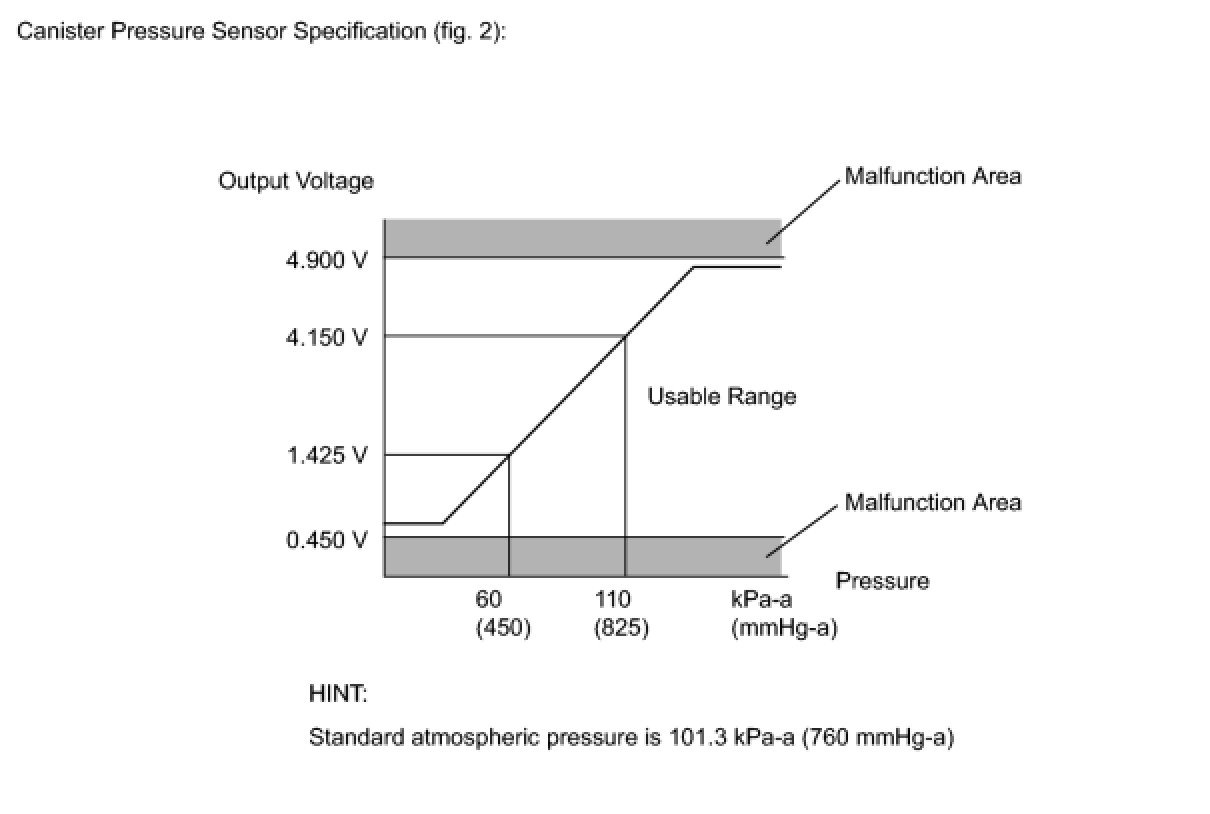 The vent valve is turned ON (closed) and the EVAP pressure is measured. If the variation in the pressure is less than 0.5 kPa-g (3.75 mmHg-g), the ECM interprets this as the purge VSV being stuck closed, and illuminates the MIL and stores DTC P0441 (2 trip detection logic).