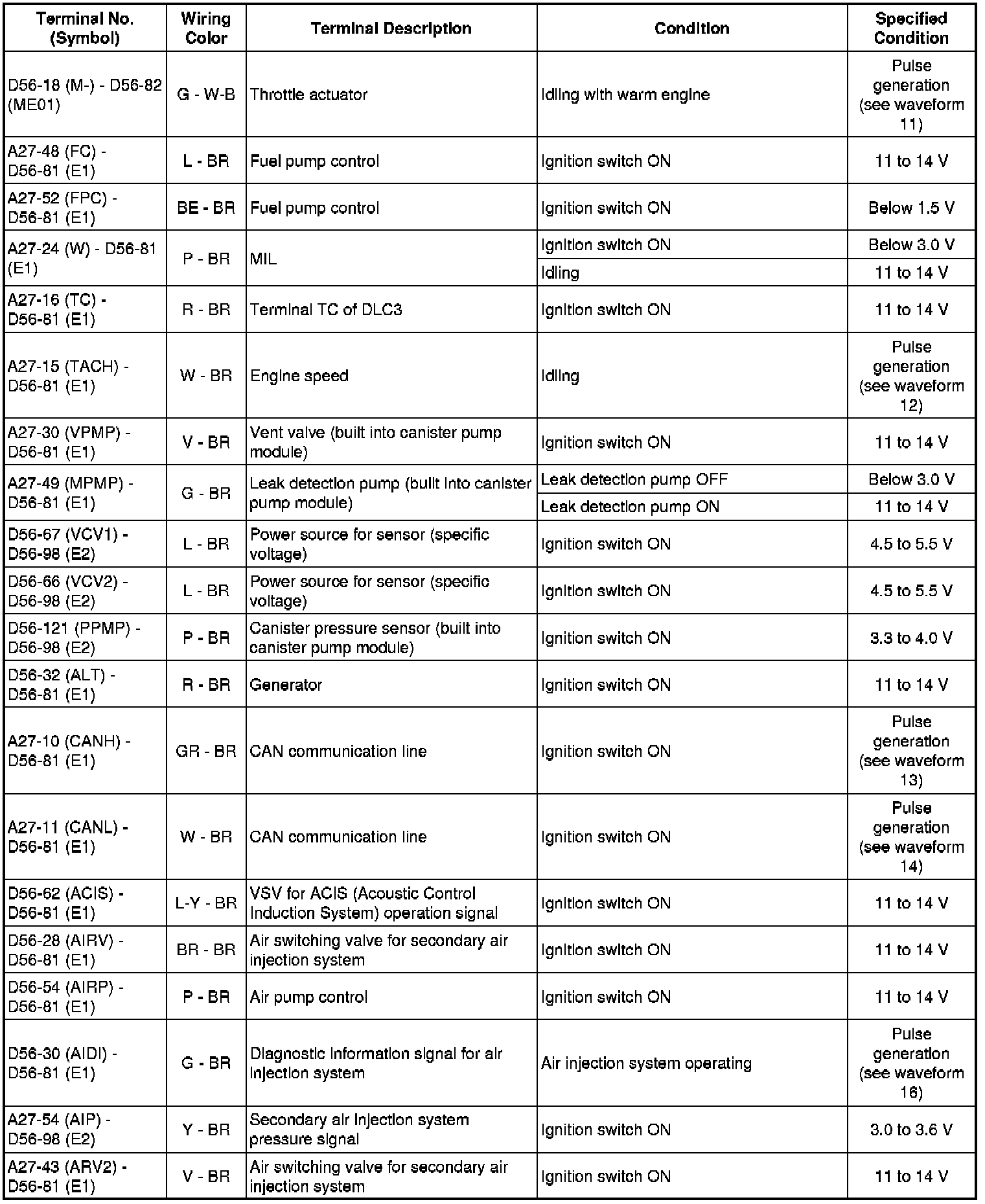 The standard voltage between each pair of ECM terminals is shown in the table below. The appropriate conditions for checking each pair of terminals are also indicated. The result of checks should be compared with the standard voltage for that pair of terminals, displayed in the Specified Condition column. The illustration above can be used as a reference to identify the ECM terminal locations.