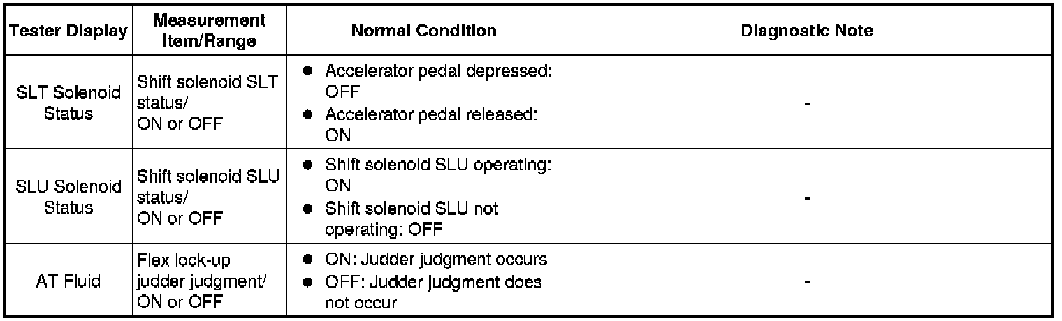 *: Activate the Solenoid (SLT) in the Active Test is performed to check the line pressure changes by connecting SST to the automatic transmission, which is used in the Hydraulic Test Hydraulic Test as well. Please note that the pressure values in the Active Test and Hydraulic Test are different.