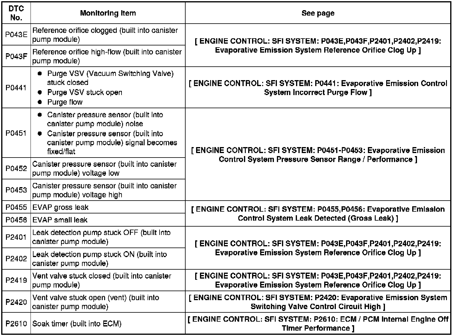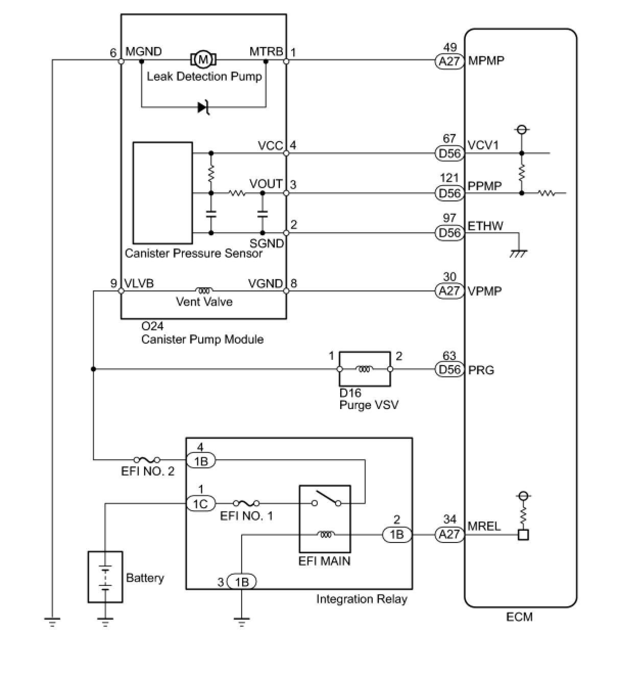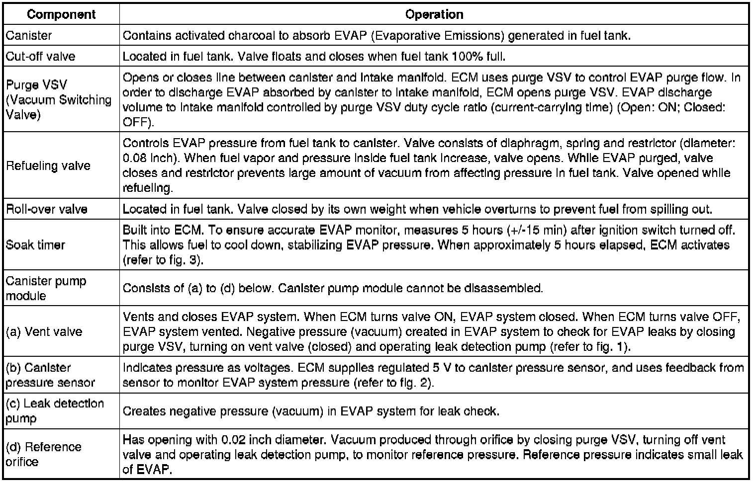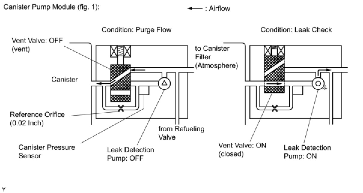 The leak detection pump creates negative pressure (vacuum) in the EVAP system and the pressure is measured. Finally, the ECM monitors for leaks from the EVAP system, and malfunctions in both the canister pump module and purge VSV, based on the EVAP pressure.