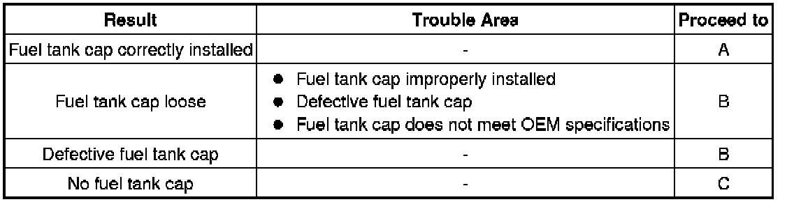 If any EVAP system DTCs are stored, the malfunctioning area can be determined using the table below.