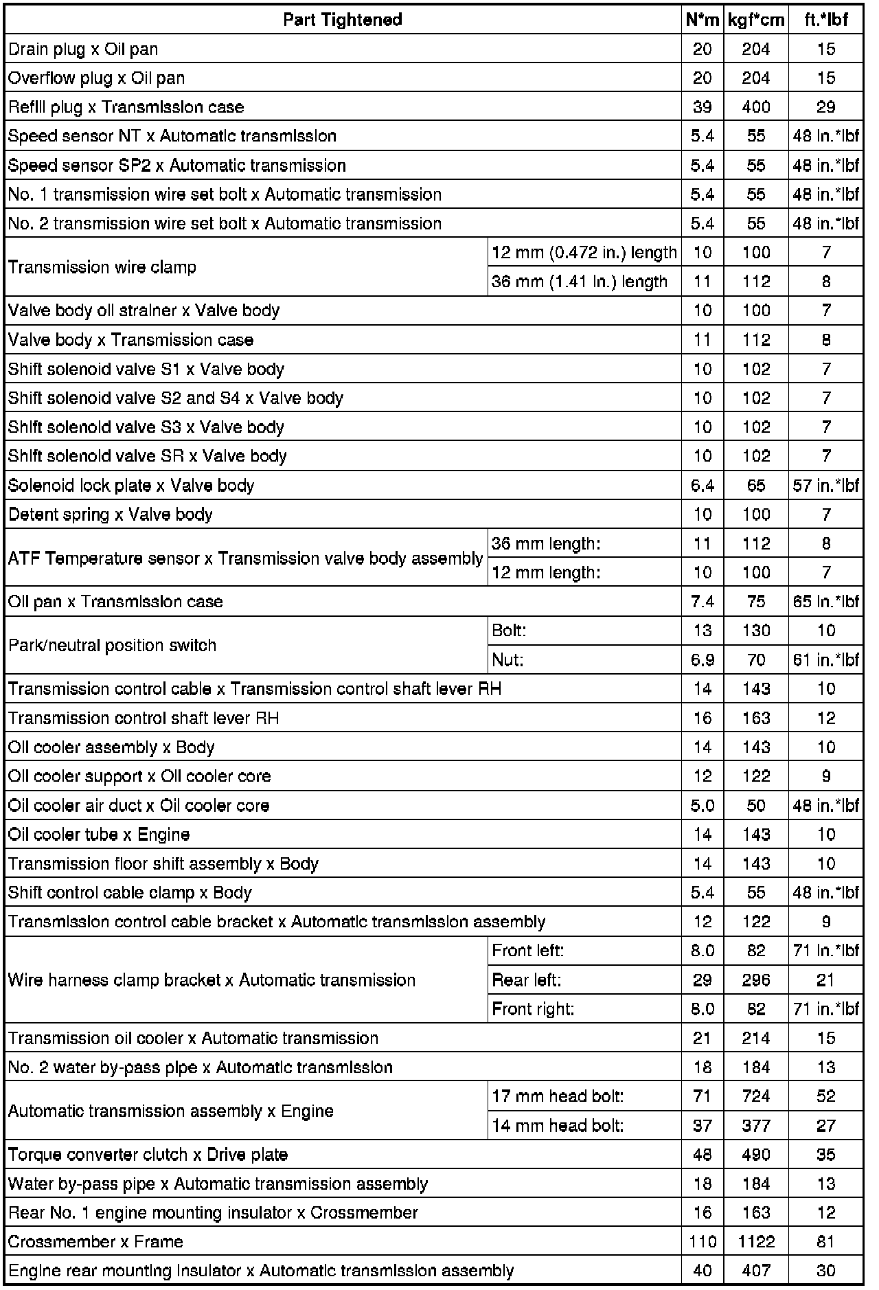 SPECIFICATIONS: AB60E AUTOMATIC TRANSMISSION / TRANSAXLE: TORQUE SPECIFICATIONS