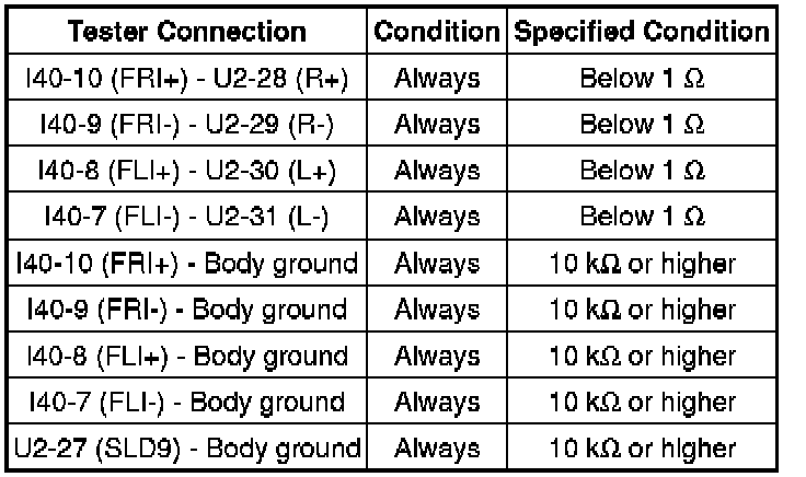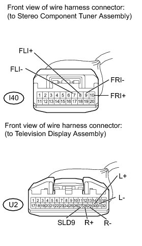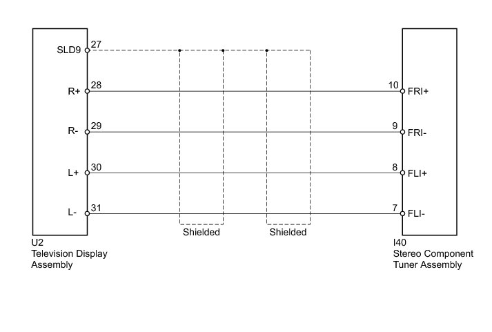 The stereo component tuner assembly sends sound signals to the television display assembly through this circuit. If there is an open or short in the circuit, sound cannot be heard from the speakers even if there is no malfunction in the stereo component amplifier assembly, navigation receiver assembly or speakers.