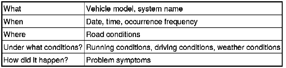 The most difficult case in troubleshooting is when no problem symptoms occur. In such a case, a thorough problem analysis must be carried out. A simulation of the same or similar conditions and environment in which the problem occurred in the customer's vehicle should be carried out. No matter how much skill or experience a technician has, troubleshooting without confirming the problem symptoms will lead to important repairs being overlooked and mistakes or delays.