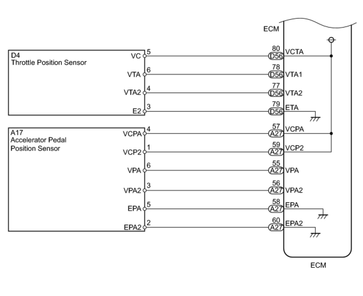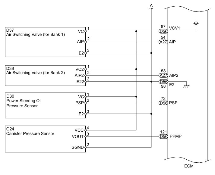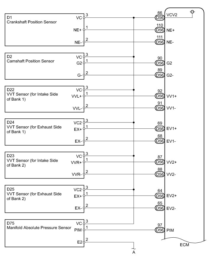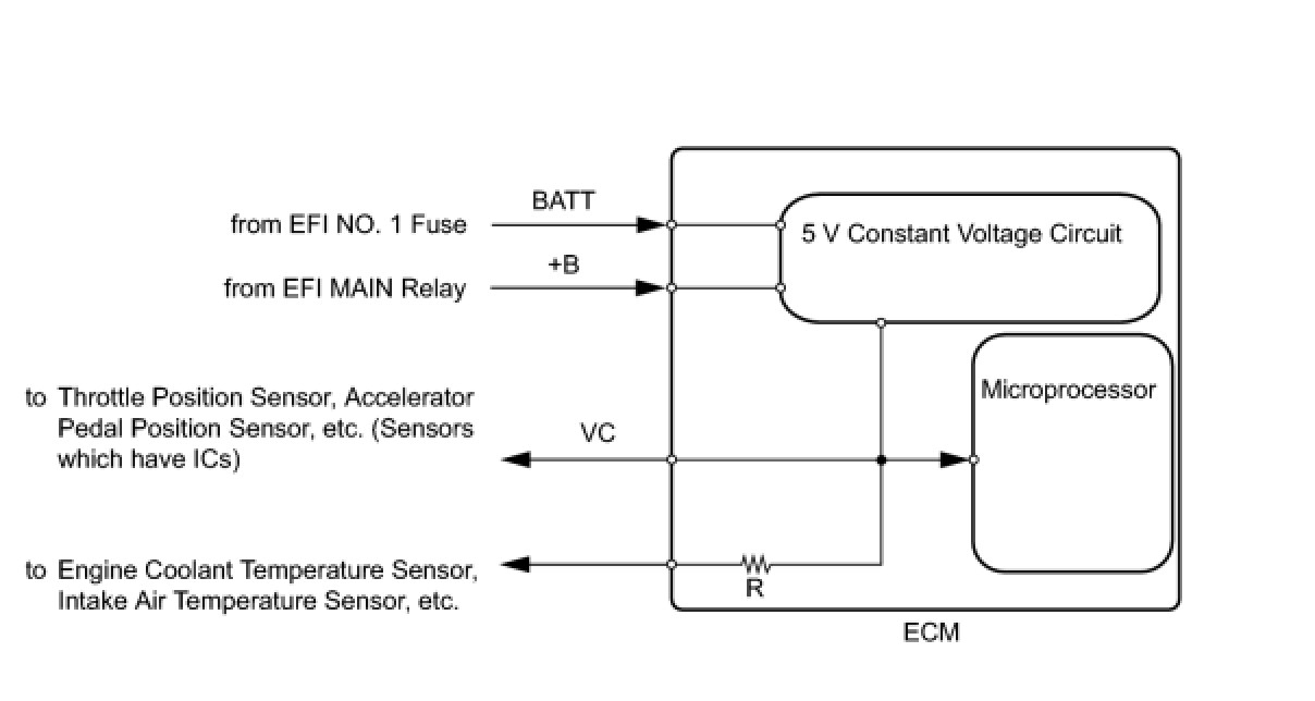 The ECM constantly generates 5 V power from the battery voltage supplied to the +B (BATT) terminal to operate the microprocessor. The ECM also provides this power to the sensors through the VC output circuit.