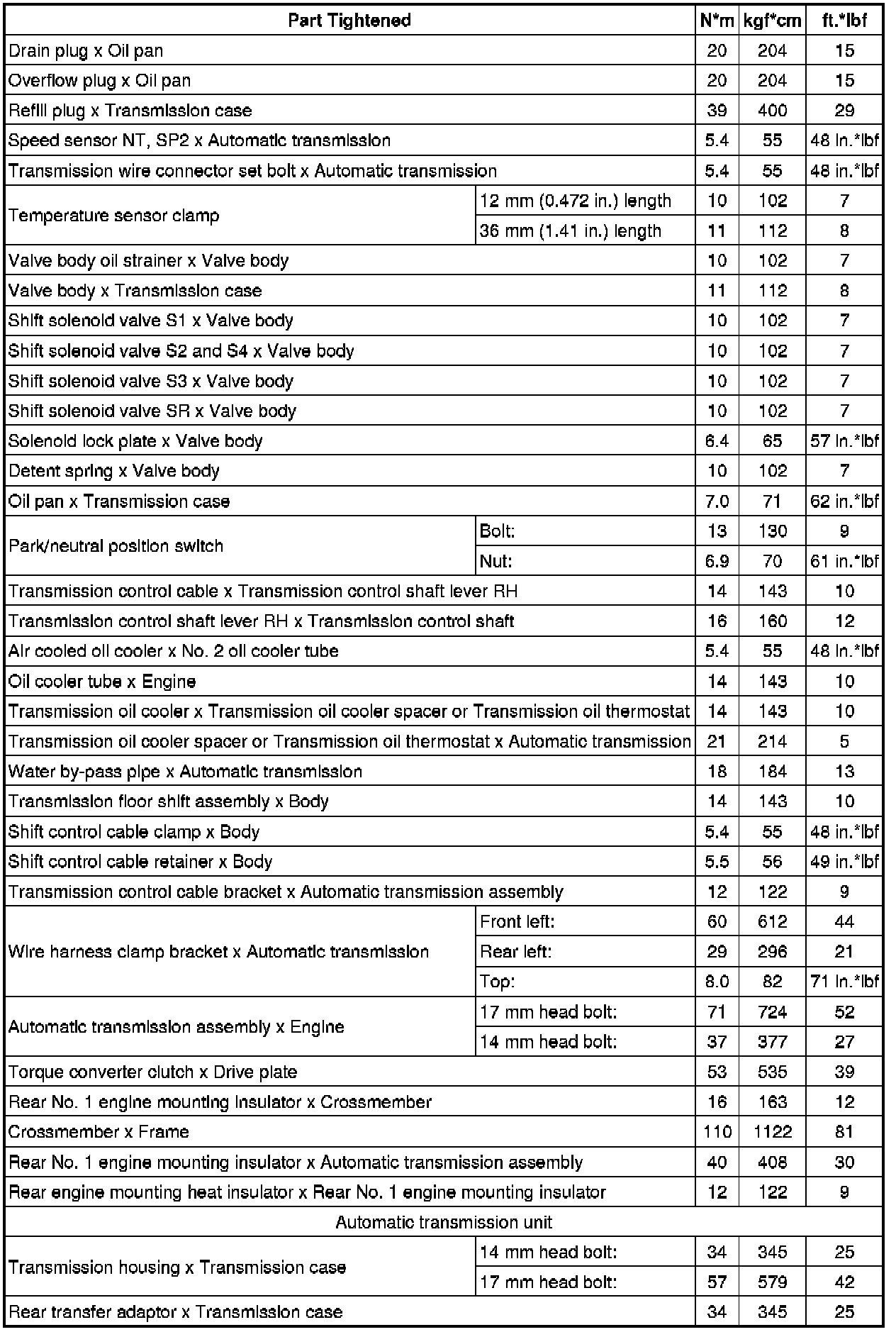SPECIFICATIONS: A760F AUTOMATIC TRANSMISSION / TRANSAXLE: TORQUE SPECIFICATIONS