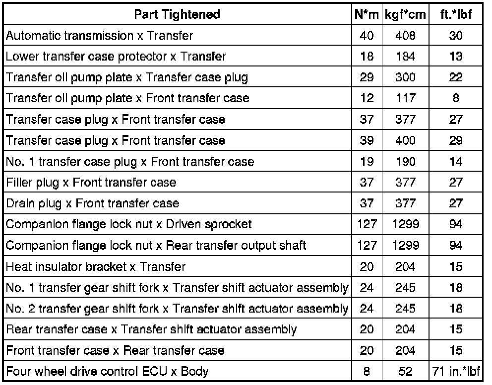 SPECIFICATIONS: JF3A TRANSFER / 4WD / AWD: TORQUE SPECIFICATIONS