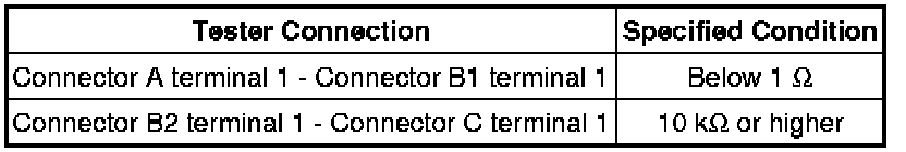 * If the results match the examples above, an open circuit exists in the wire harness between terminal 1 of connector B and terminal 1 of connector C.