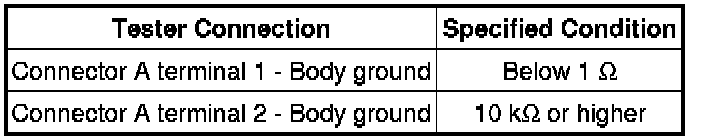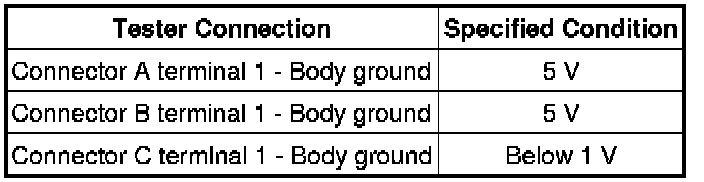 With each connector still connected, measure the voltage between the body ground and these terminals (in this order): 1) terminal 1 of connector A; 2) terminal 1 of connector B; and 3) terminal 1 of connector C.