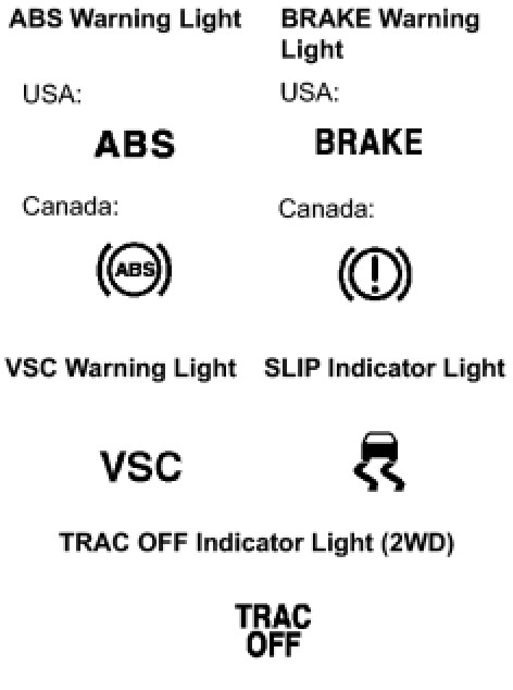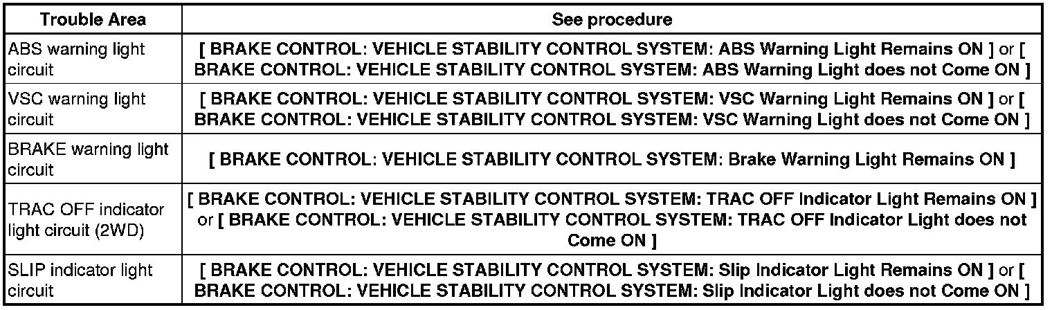 (2) When the ignition switch is turned to the ON position, check that the ABS warning light, BRAKE warning light, VSC warning light, TRAC OFF indicator light (2WD) and SLIP indicator light stay on for approx. 3 seconds.