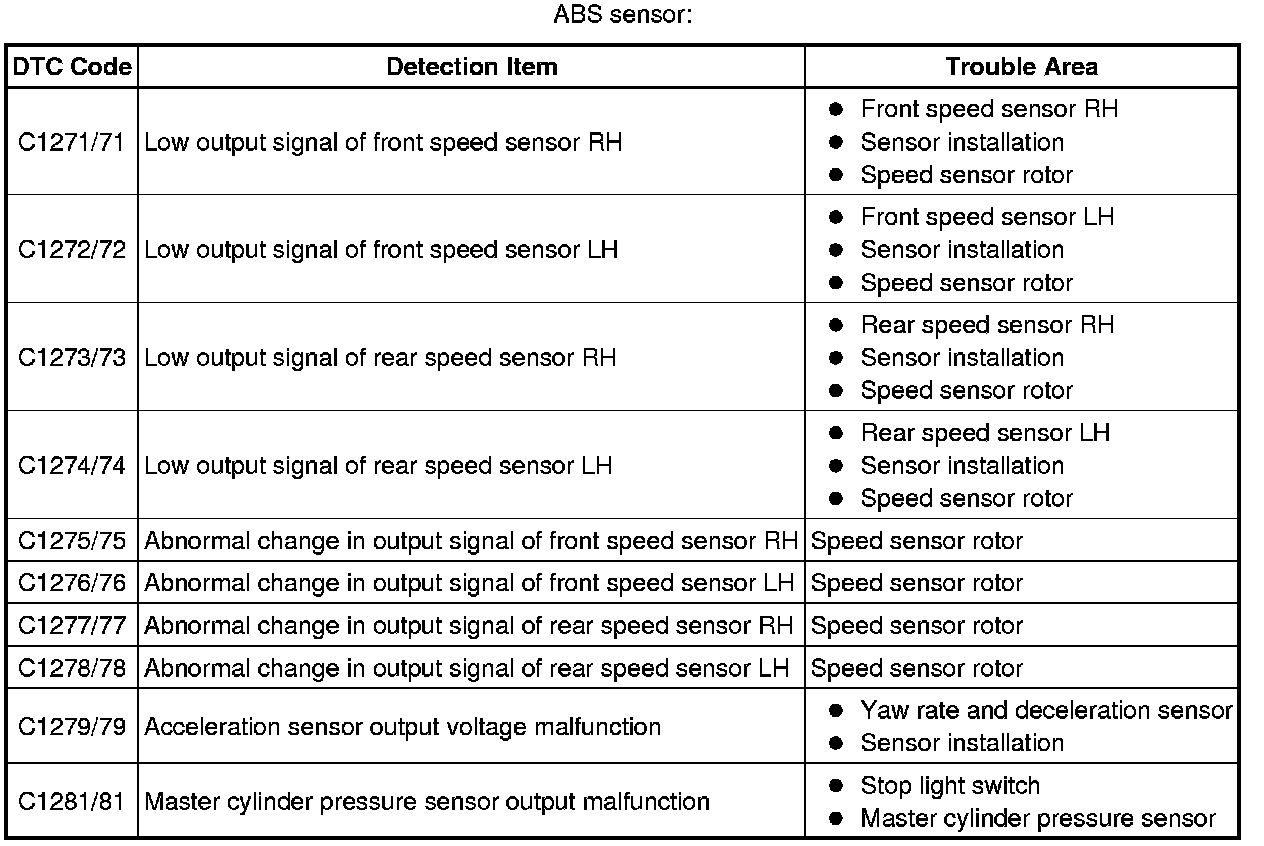 * After the ABS warning light goes off, if vehicle speed exceeds 80 km/h (50 mph), a signal check code will be stored again. Decelerate or stop the vehicle before the speed reaches 80 km/h (50 mph).