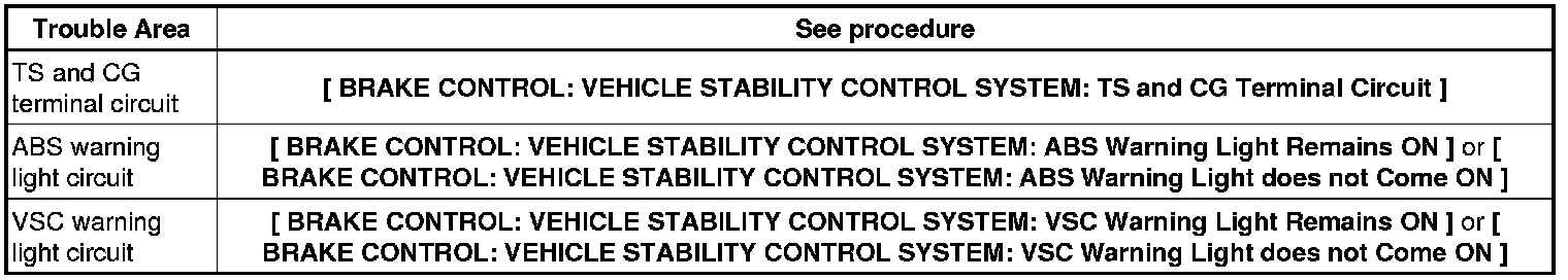 If the ABS warning light and VSC warning light do not blink, inspect the TS and CG terminal circuit, ABS warning light circuit and/or VSC warning light circuit.