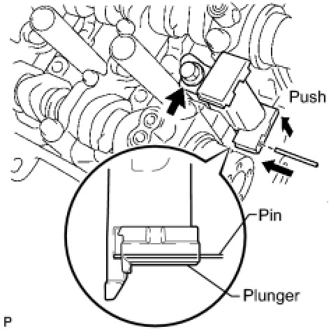 (b) While pushing in the tensioner, insert a pin of dia 1.0 mm (0.039 in.) into the hole to hold it.