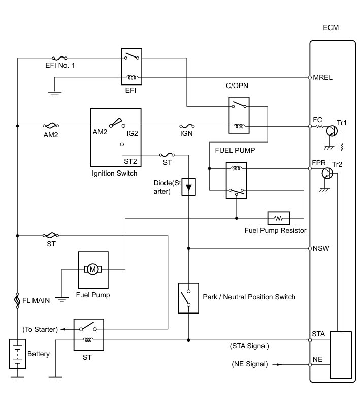 The FUEL PUMP relay switches the fuel pump speed according to the engine conditions. The fuel pump operates when the ECM receives the starter-operating signal (STA) and crankshaft-rotating signal (NE).