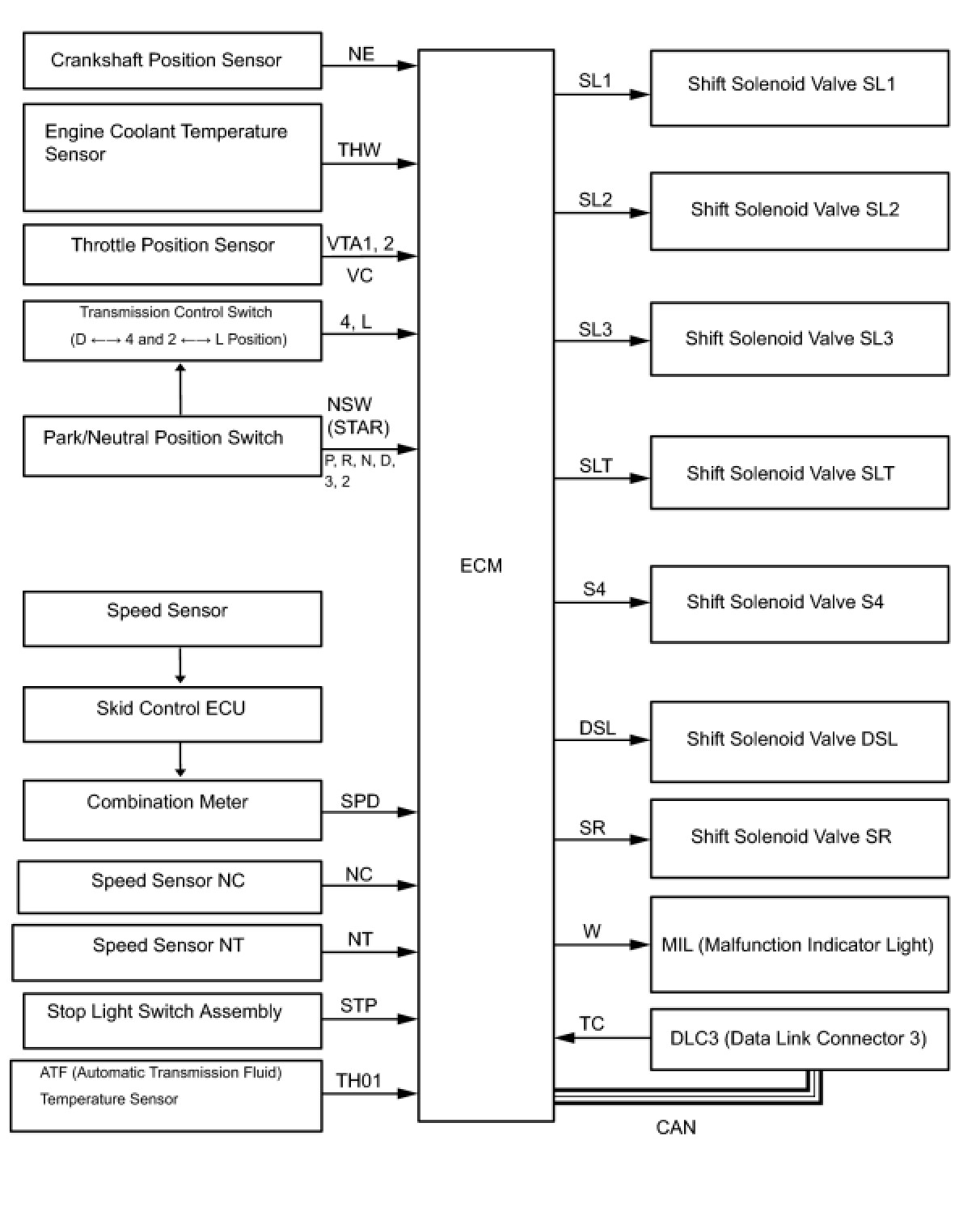 The configuration of the electronic control system in the U151F automatic transaxles is as shown in the following chart.