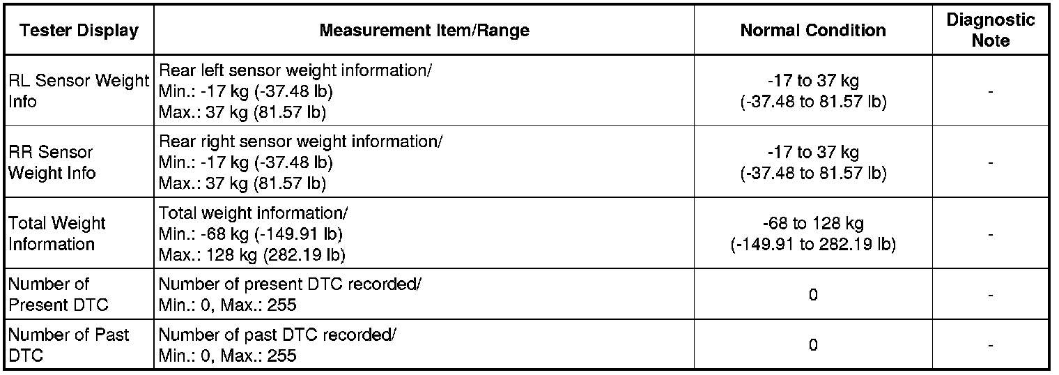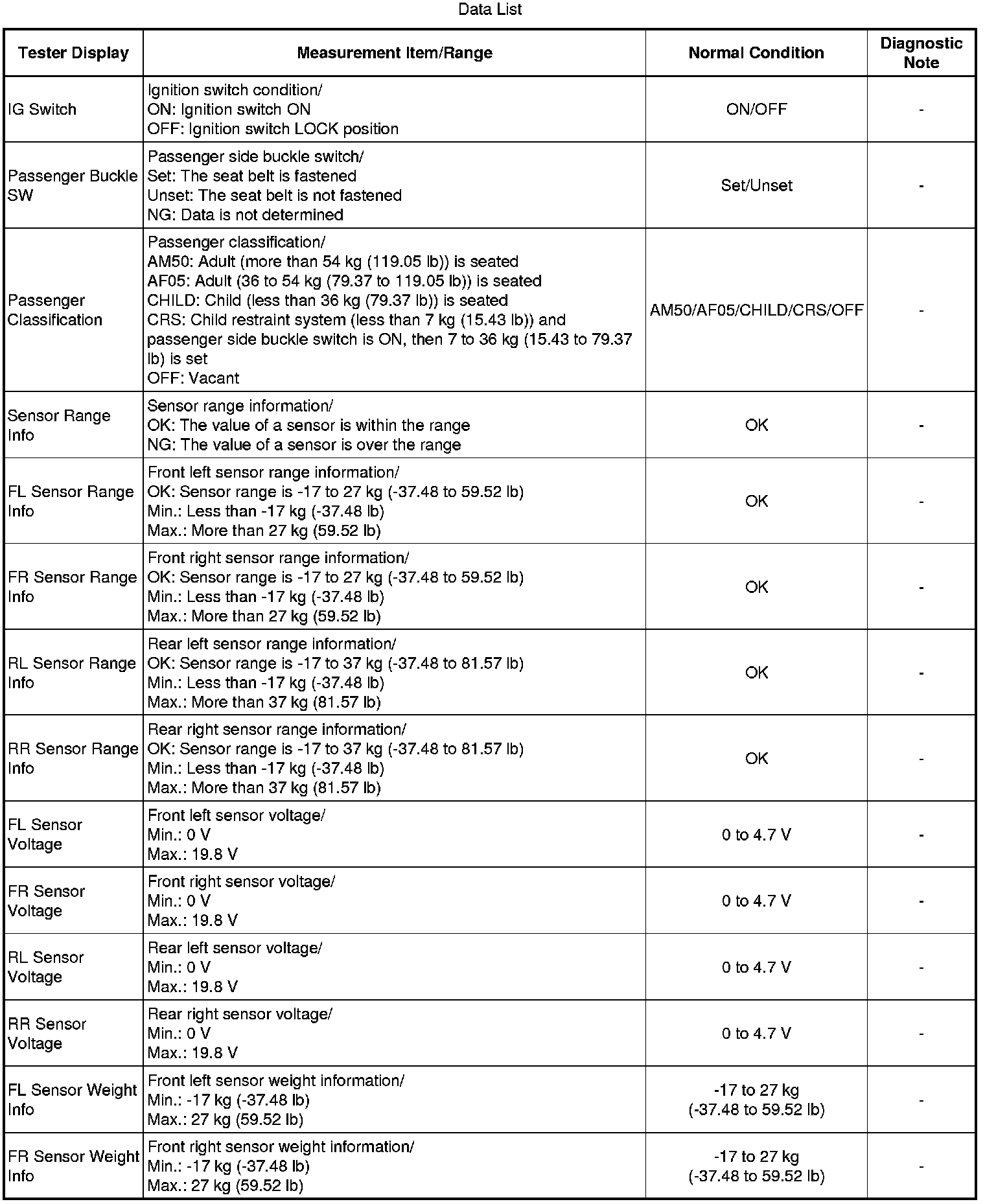 1. DATA LIST FOR OCCUPANT CLASSIFICATION ECU