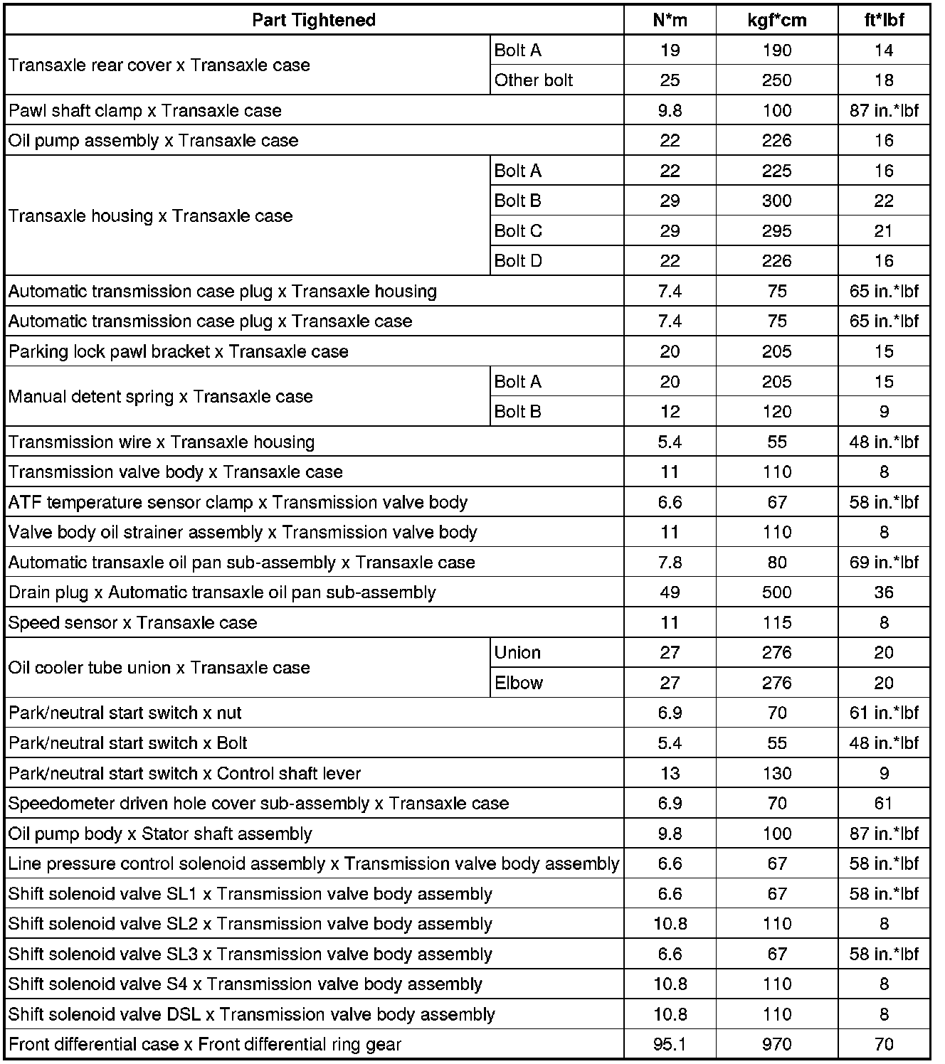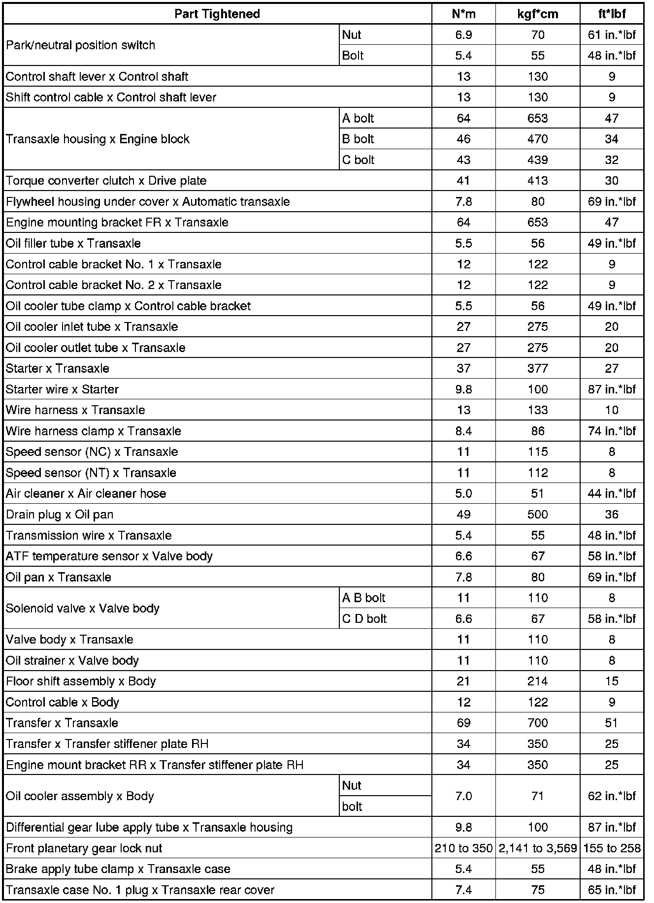 SERVICE SPECIFICATIONS: U151F AUTOMATIC TRANSAXLE: TORQUE SPECIFICATIONS