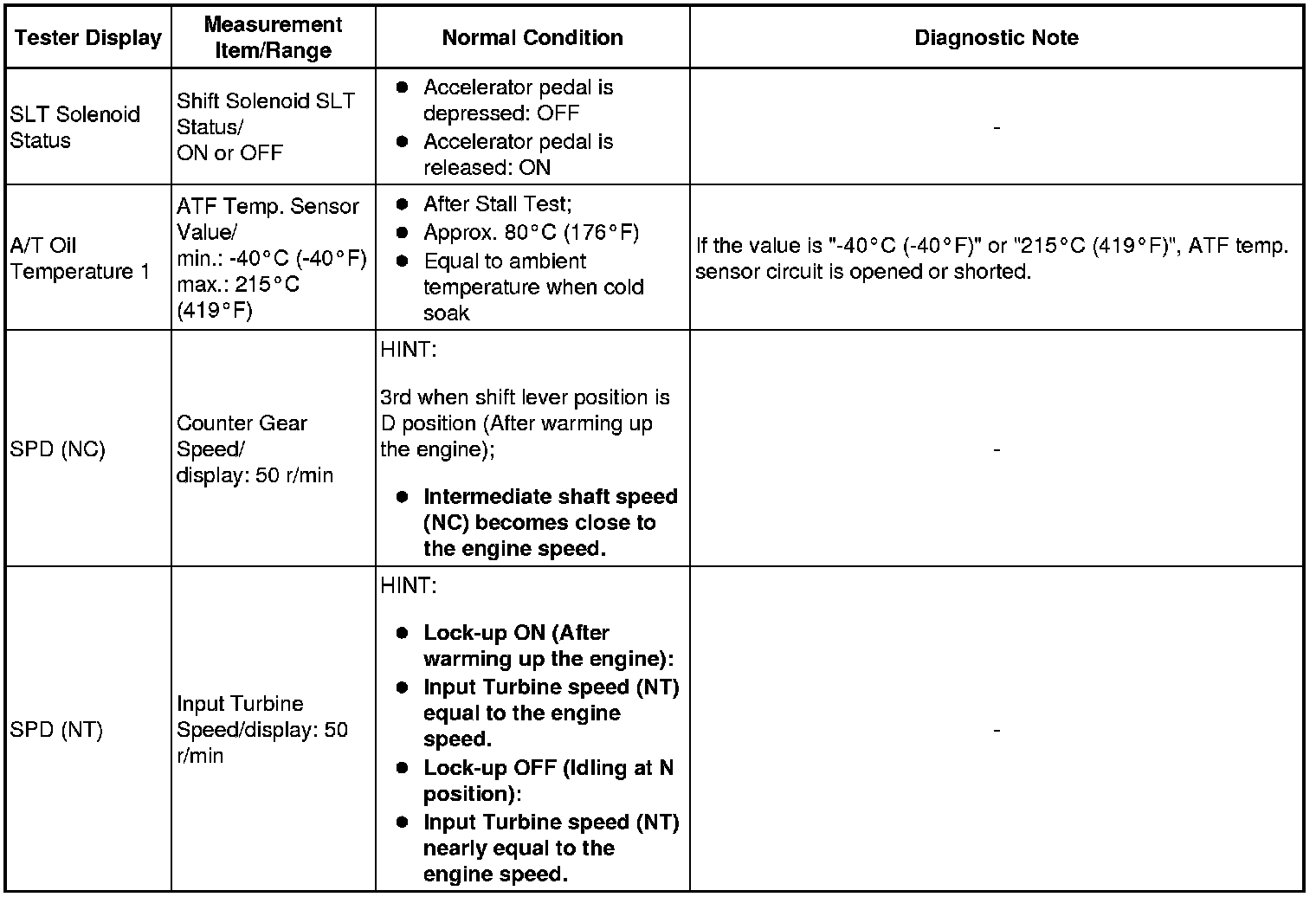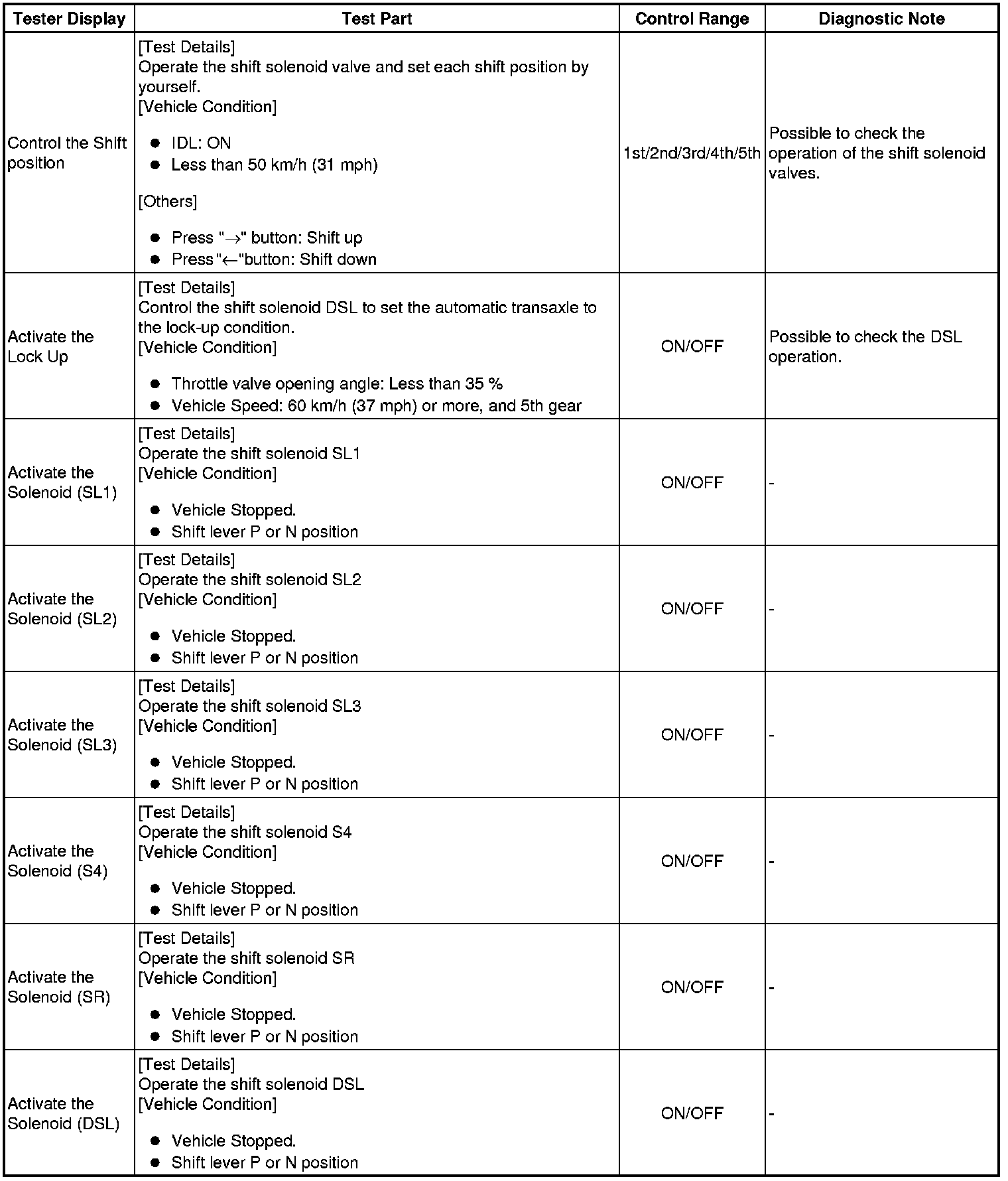 (h) *: "Activate the Solenoid (SLT)" in the Active Test is performed to check the line pressure changes by connecting the SST to the automatic transaxle, which is used in the HYDRAULIC TEST Hydraulic Test as well.