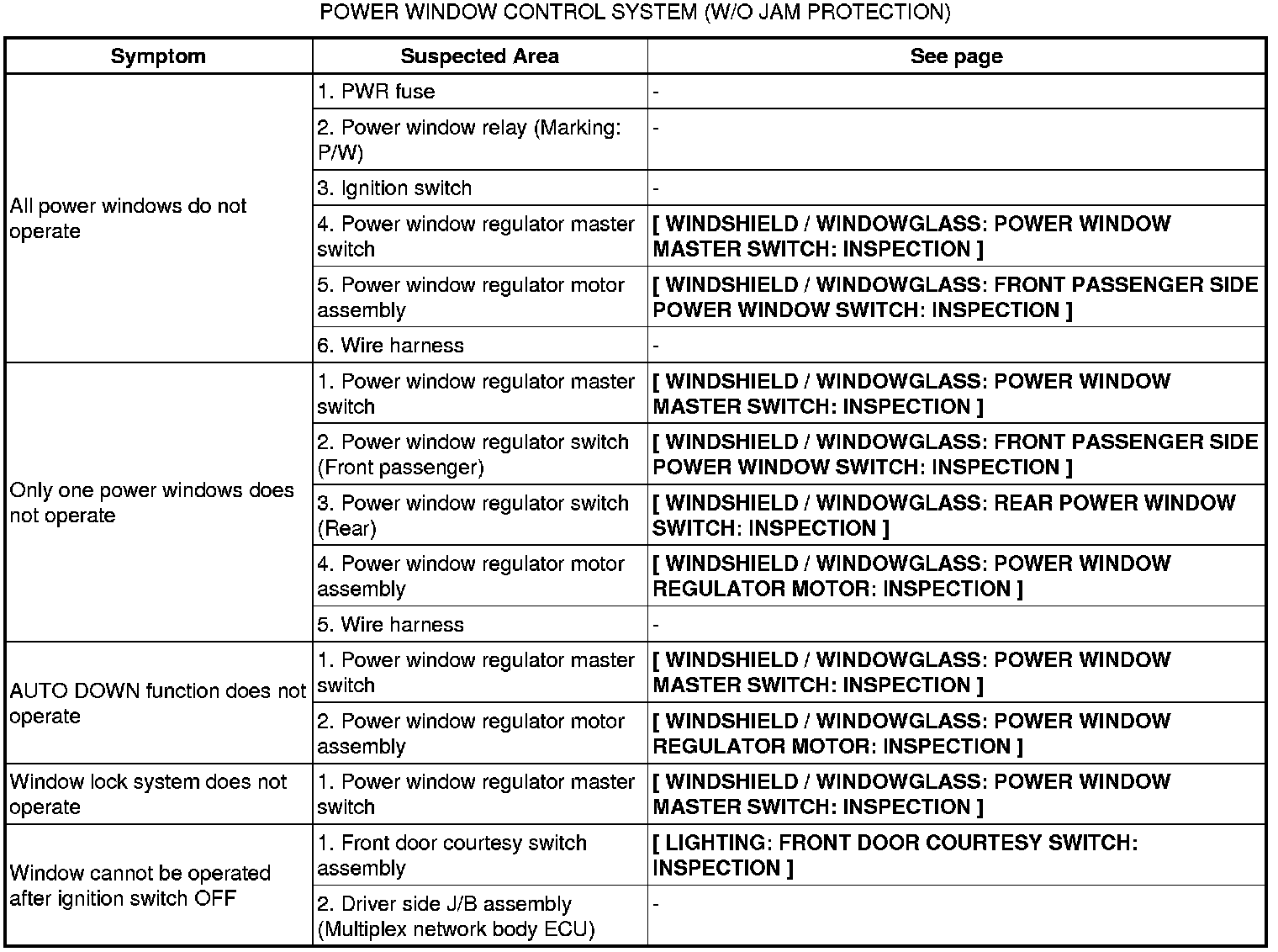 / WINDOWGLASS: POWER WINDOW CONTROL SYSTEM (w/o Jam Protection Function): PROBLEM SYMPTOMS TABLE