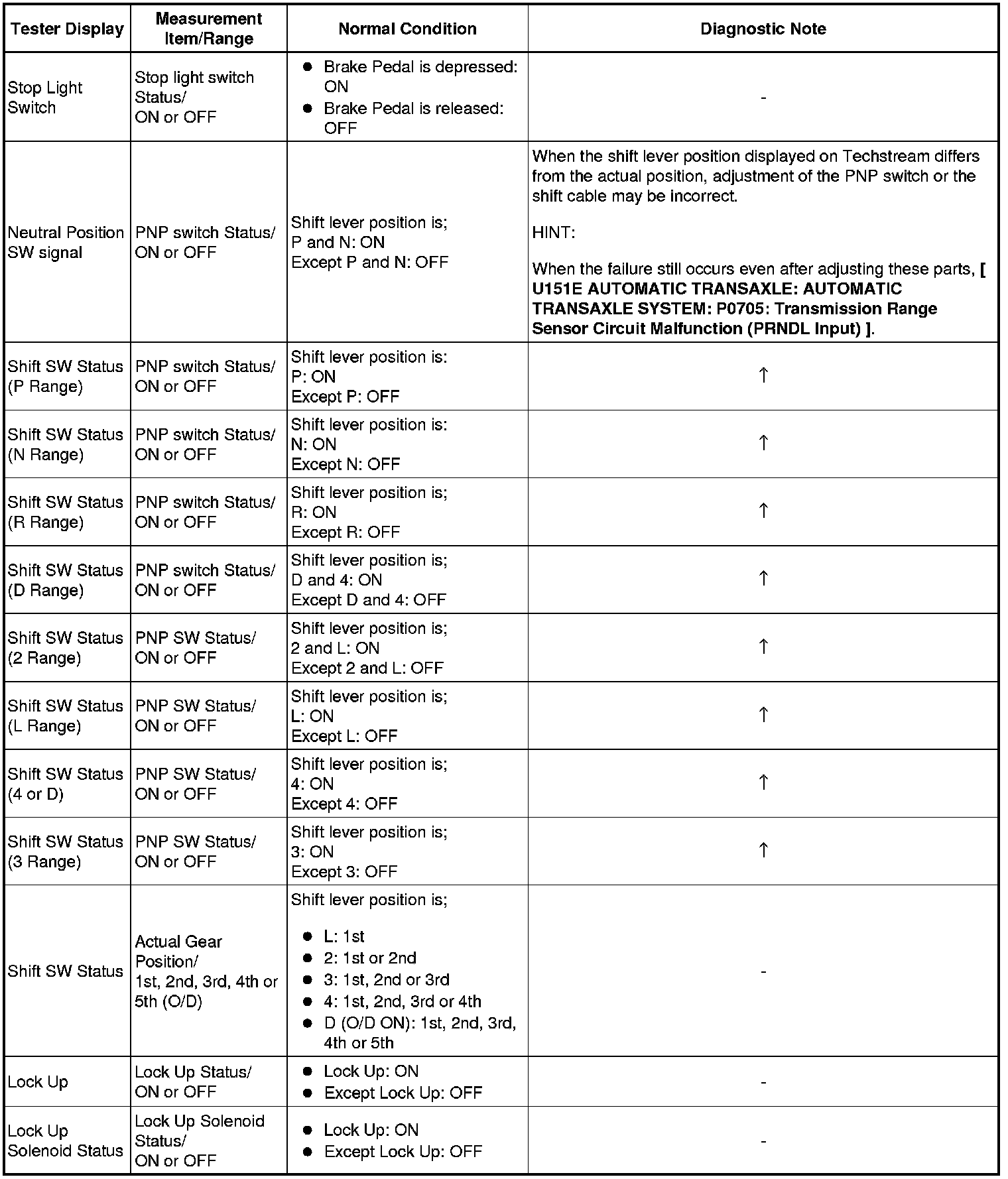 Using Techstream to read the Data List allows the values or states of switches, sensors, actuators and other items to be read without removing any parts. This non-intrusive inspection can be very useful because intermittent conditions or signals may be discovered before parts or wiring is disturbed. Reading the Data List information early in troubleshooting is one way to save diagnostic time.