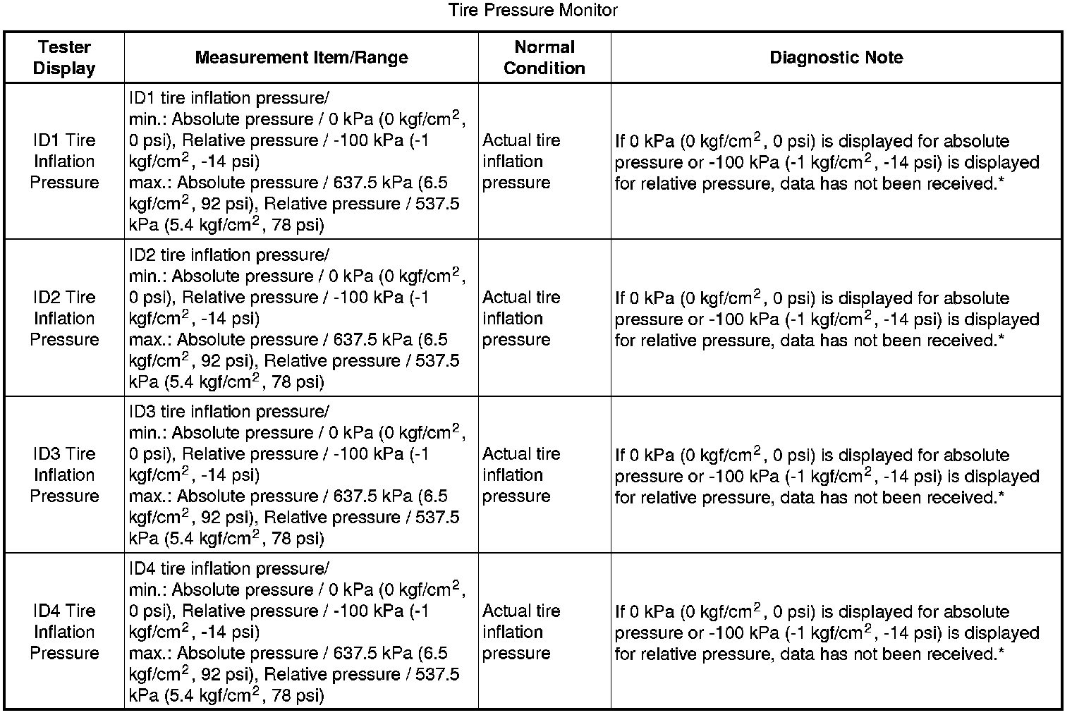 * The initialization is complete when the Data List "ID Tire Inflation Pressure" display shows the correct pressures.