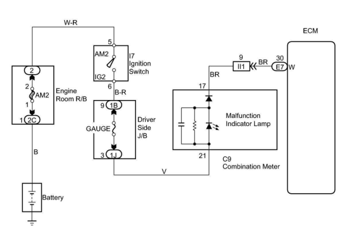 By turning the ignition switch to ON, power is supplied to the MIL circuit, and the ECM provides the circuit ground which illuminates the MIL.