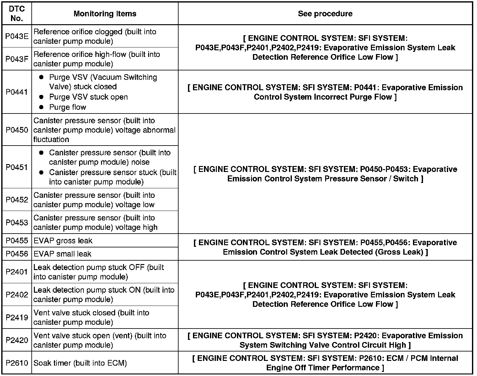 The leak detection pump creates negative pressure (vacuum) in the EVAP system and the pressure is measured. Finally, the ECM monitors for leaks from the EVAP system, and malfunctions in both the canister pump module and purge VSV, based on the EVAP pressure.