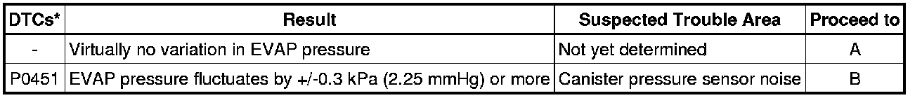If any EVAP system DTCs are set, the malfunctioning area can be determined using the table below.