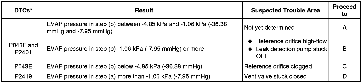 If the 0.02 inch leak criterion difference between the first and second checks is greater than the specification, the DTCs corresponding to the leak criterion (P043E, P043F, P2401, P2402 and P2419) will all be stored.