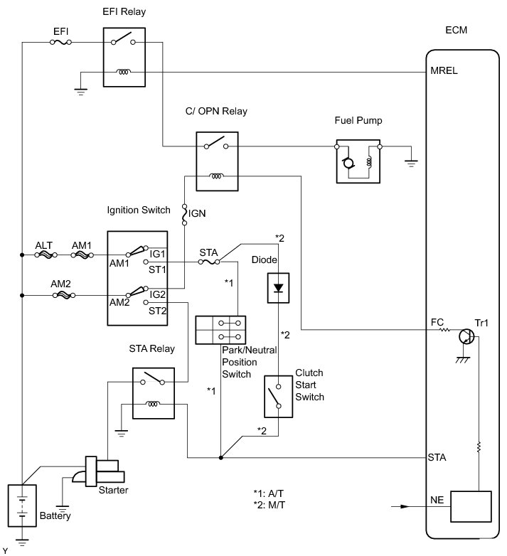 When the STA and NE signals are received by the ECM, Tr (power transistor) is switched on, allowing current to flow into the circuit opening relay coil. The circuit opening relay switches on, power is supplied to the fuel pump and the fuel pump operates.