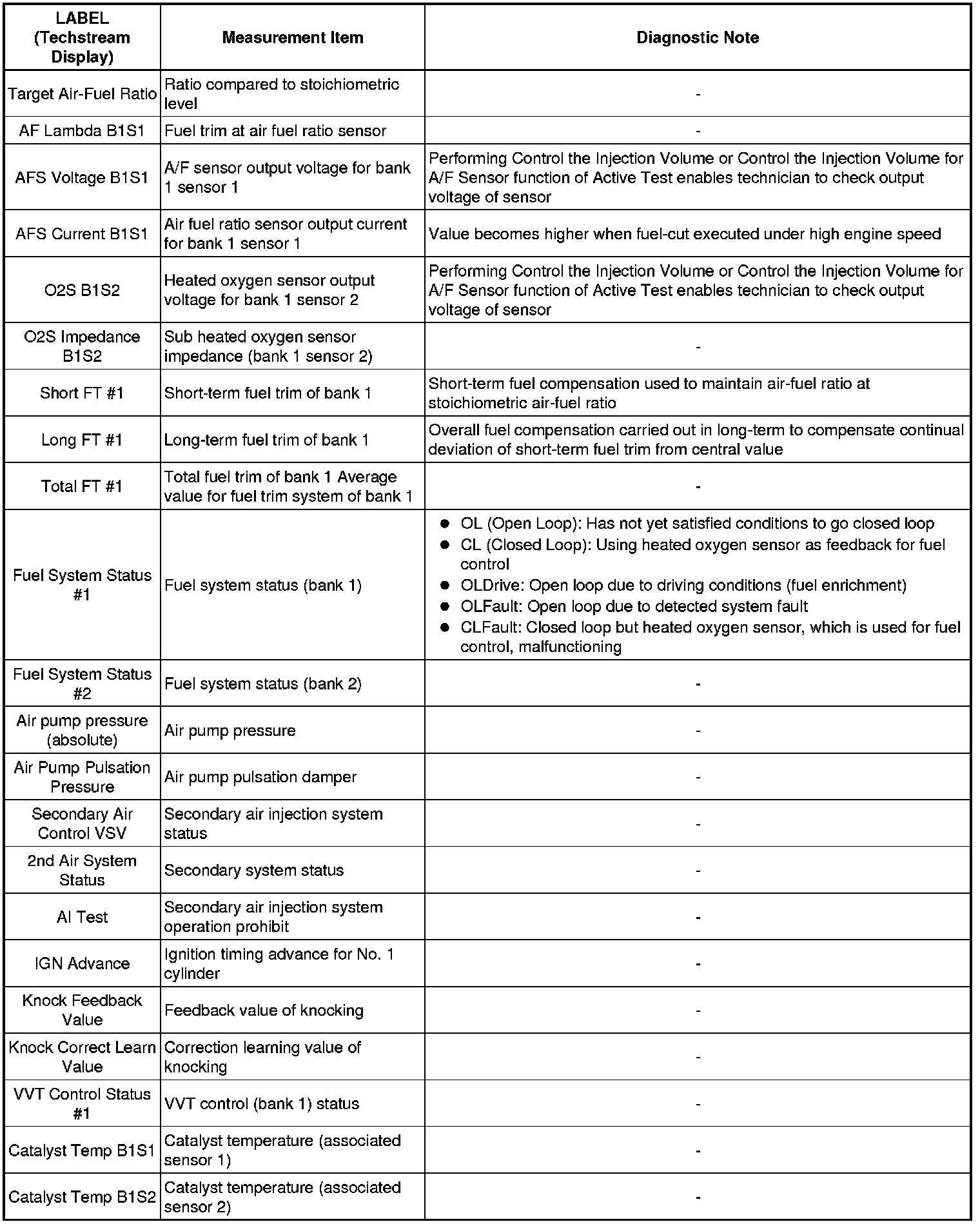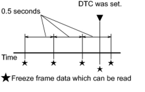 The ECM records engine conditions in the form of freeze frame data every 0.5 seconds. Using the Techstream, five separate sets of freeze frame data, including the data values at the time when the DTC was set, can be checked.