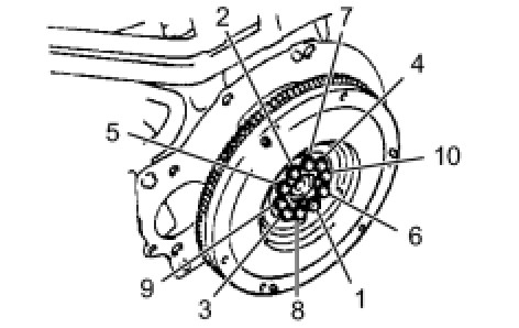 FLYWHEEL SUB-ASSEMBLY (for Manual Transmission)Using several steps, uniformly install and tighten the 10 bolts in the sequence shown in the illustration.