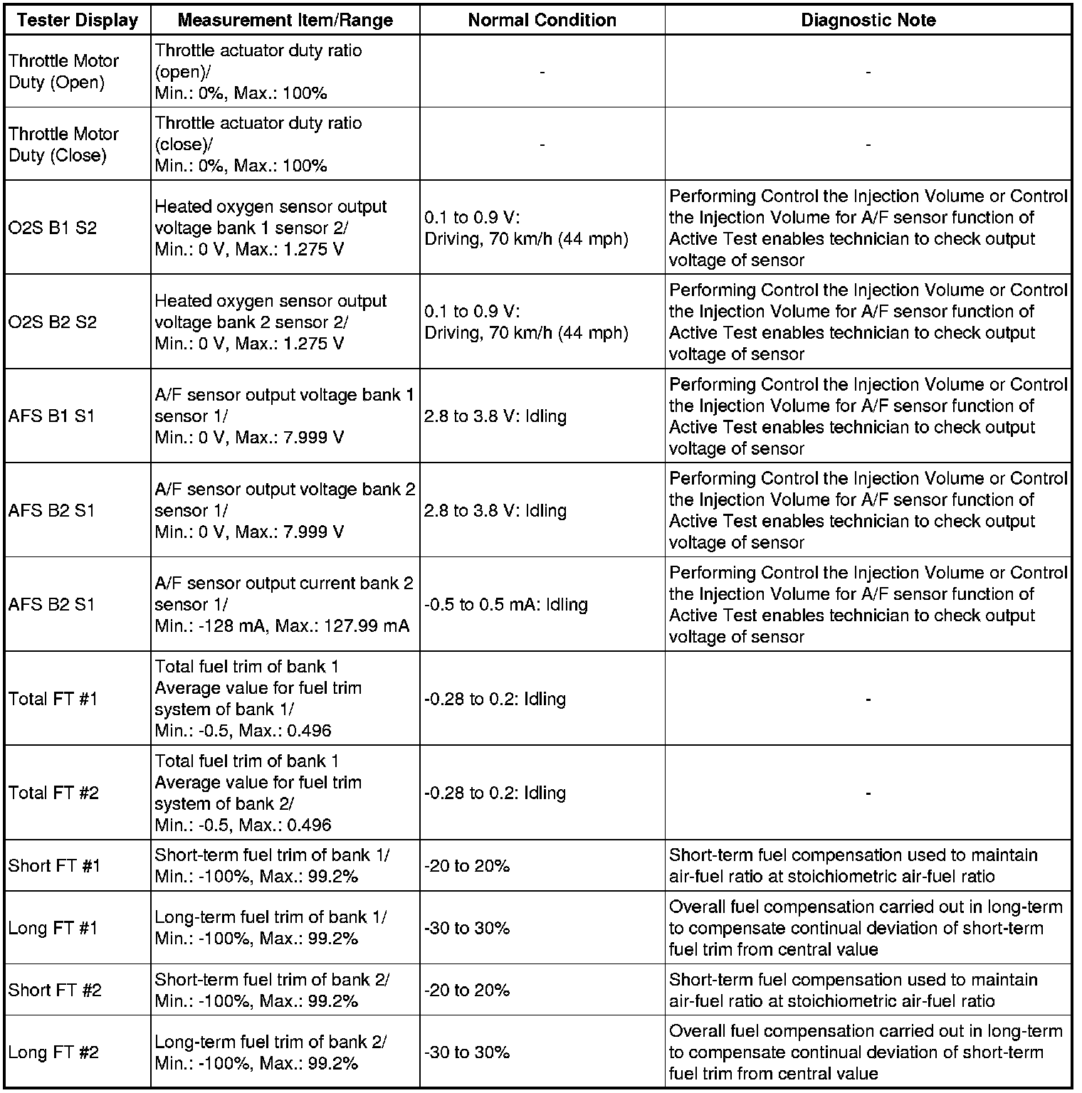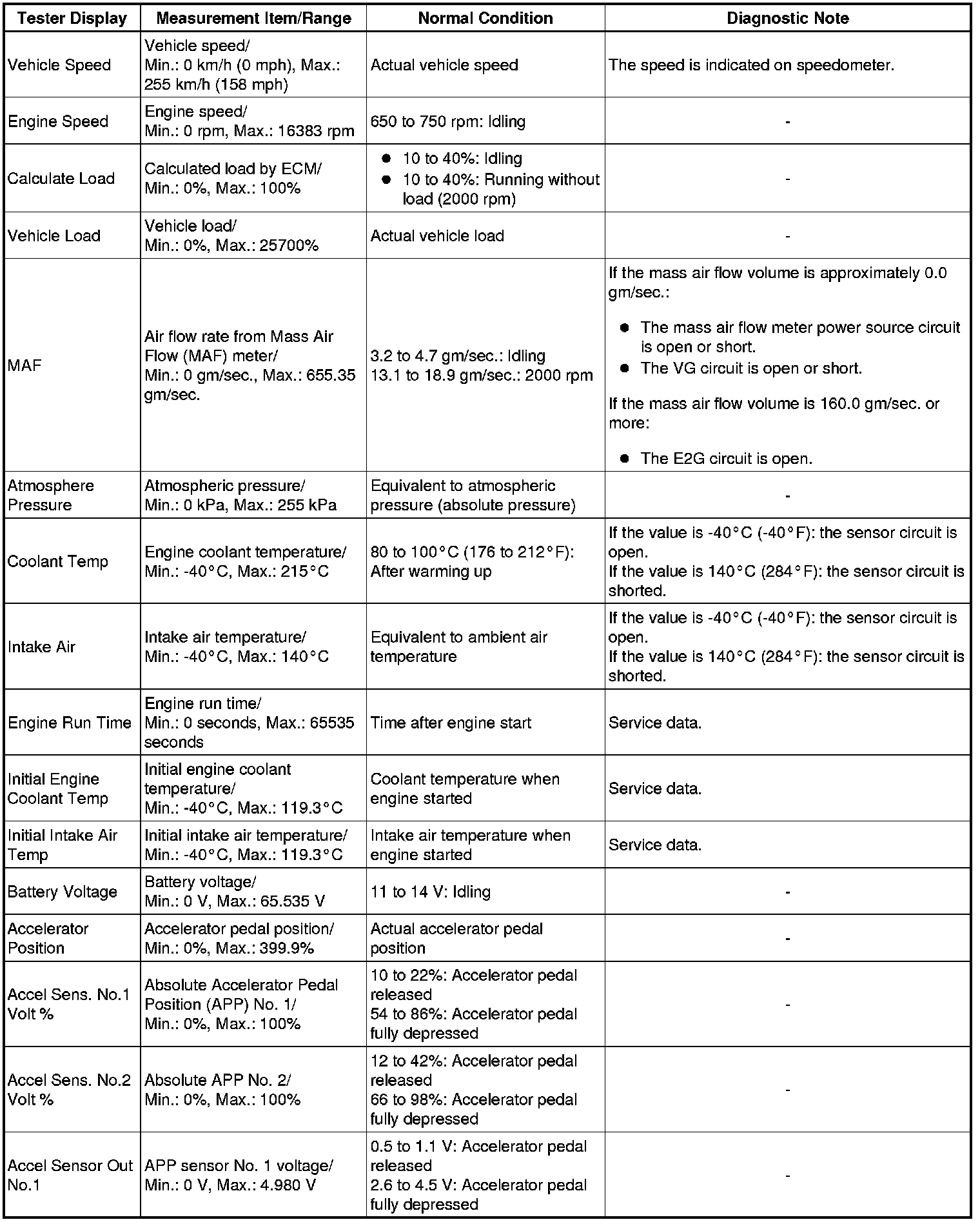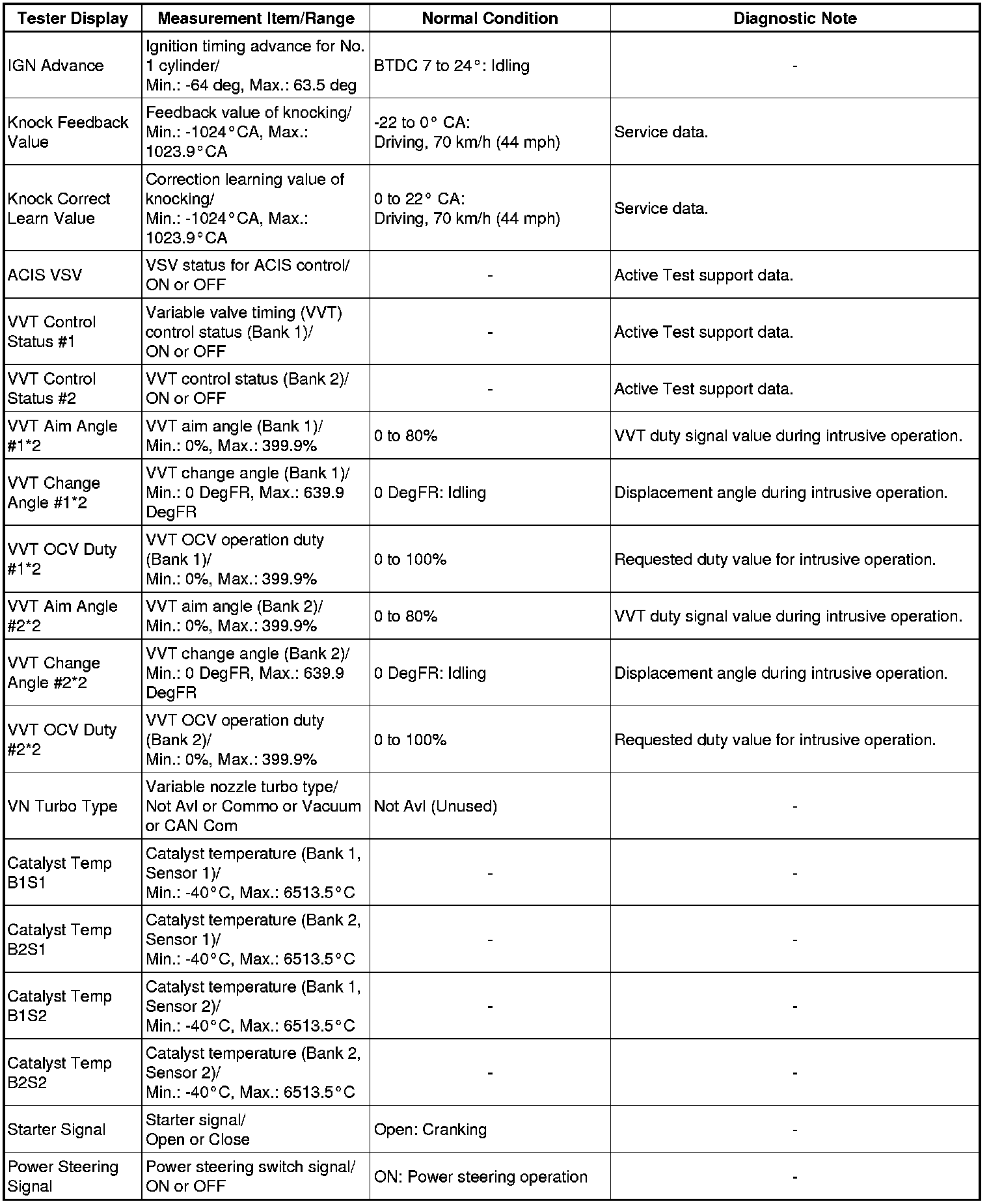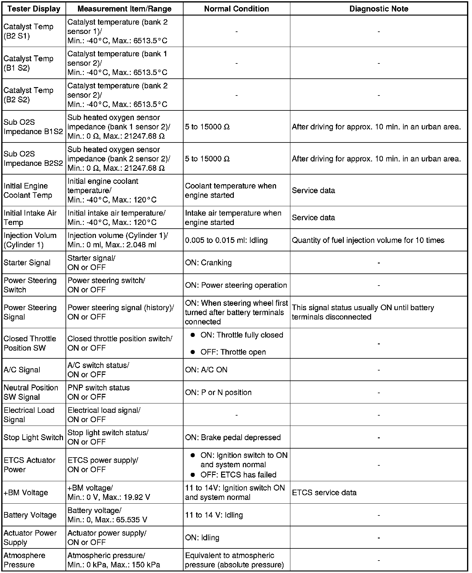 Using the Techstream to read the Data List allows the values or states of switches, sensors, actuators and other items to be read without removing any parts. This non-intrusive inspection can be very useful because intermittent conditions or signals may be discovered before parts or wiring is disturbed. Reading the Data List information early in troubleshooting is one way to save diagnostic time