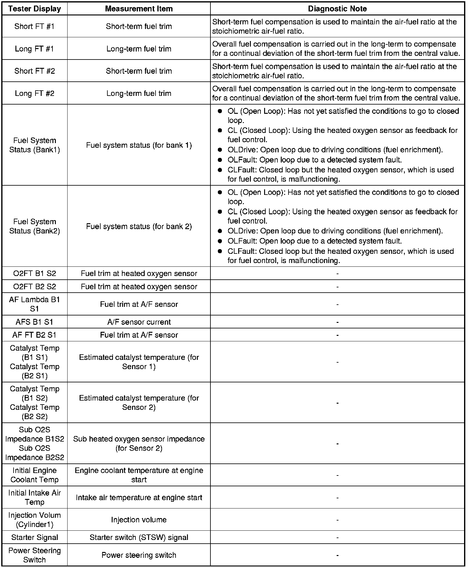 Freeze frame data record the engine conditions (fuel system, calculated load, engine coolant temperature, fuel trim, engine speed, vehicle speed, etc.) when a malfunction is detected. When troubleshooting, it can help determine if the vehicle was running or stopped, the engine was warmed up or not, the air-fuel ratio was LEAN or RICH, and other data, from the time the malfunction occurred.
