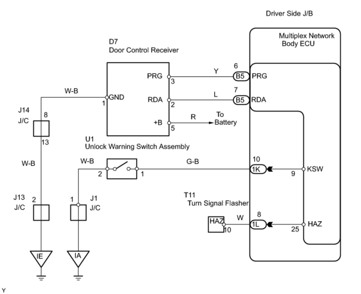 11. CHECK HARNESS AND CONNECTOR (UNLOCK WARNING SWITCH - DRIVER SIDE J/B AND BODY GROUND)