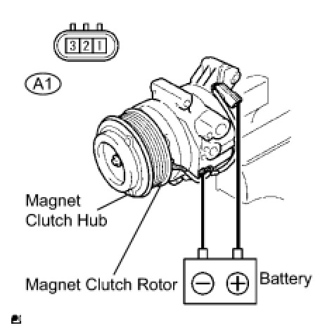 (b) Confirm that the magnet clutch hub and magnet clutch rotor lock when the battery positive lead is connected to terminal 1 (MG+) of the magnet clutch, and the negative lead is connected to the earth wire.