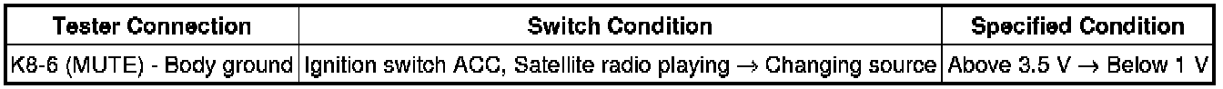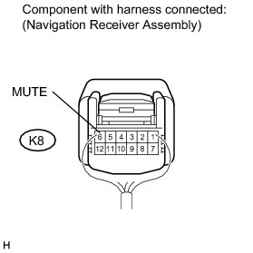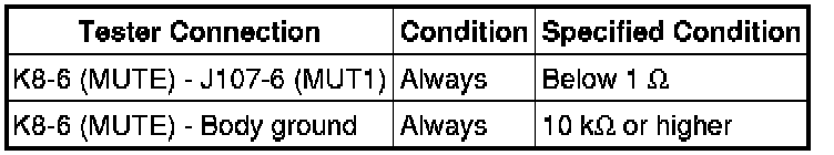 The MUTE signal is sent to reduce noise and a popping sound generated when switching the mode etc. If there is an open in the circuit, noise can be heard from the speakers when changing the sound source. If there is a short in the circuit, even though the navigation receiver assembly is functioning normally, no sound or only an extremely faint sound can be heard.