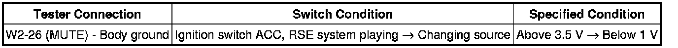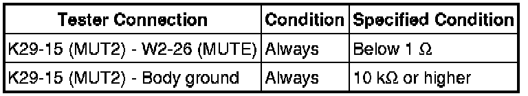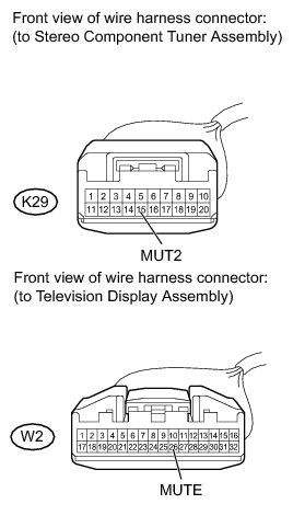 The MUTE signal is sent to reduce noise and a popping sound generated when switching the mode etc. If there is an open in the circuit, noise can be heard from the speakers when changing the sound source. If there is a short in the circuit, even though the navigation receiver assembly is functioning normally, no sound or only an extremely faint sound can be heard.