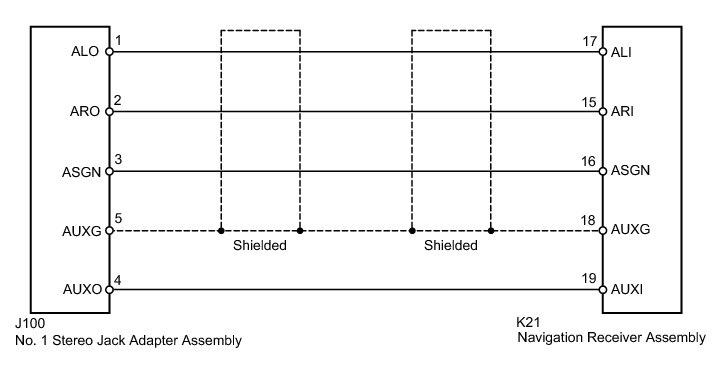 The No. 1 stereo jack adapter assembly sends an external device sound signal to the navigation receiver assembly through this circuit.